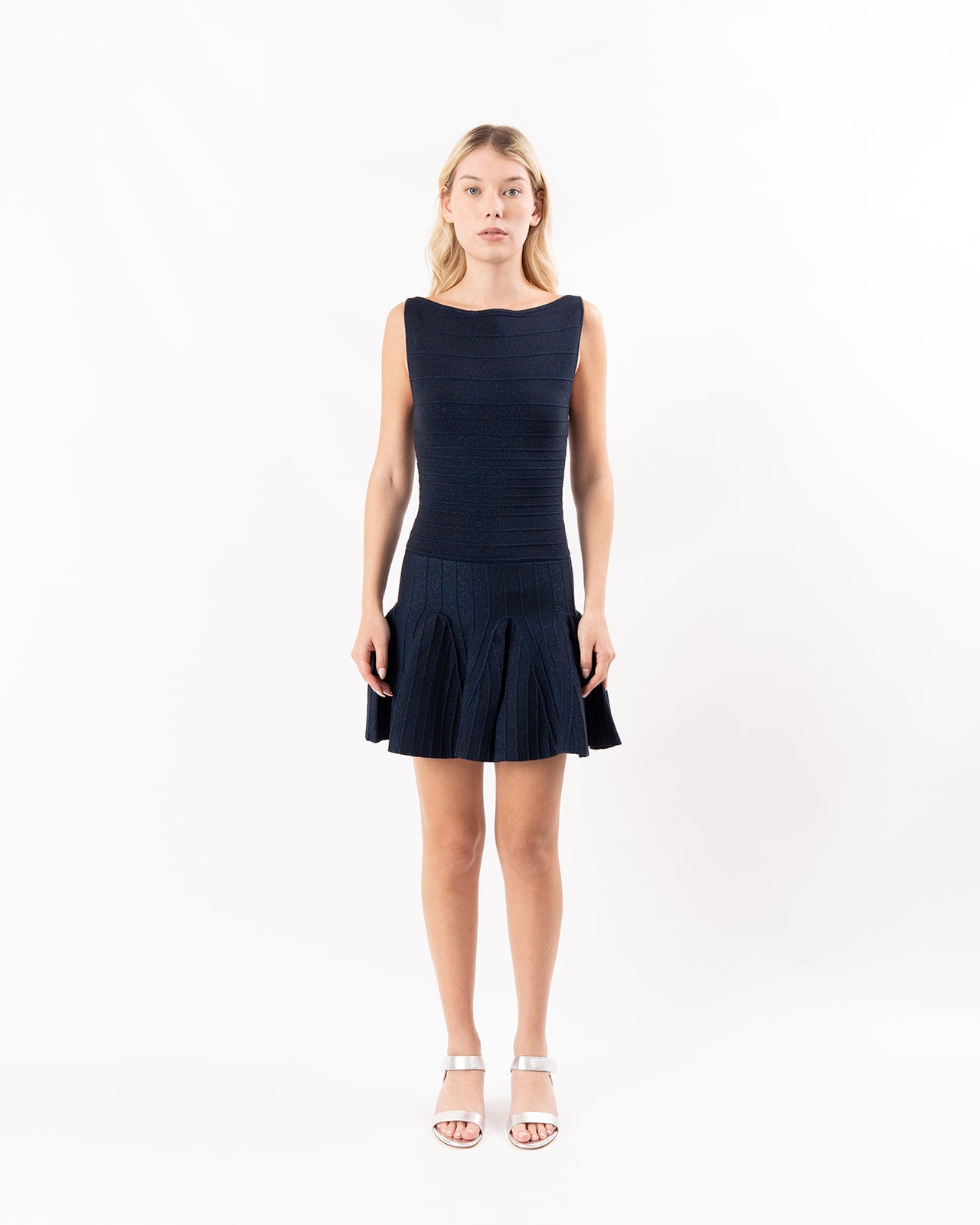 Exude elegance in the Audrina Dress. This sophisticated navy blue dress features a flattering fit-and-flare silhouette, a sleeveless design, and provides a comfortable knit material, making it perfect for both cocktail parties and evening events. Shown here in Metallic Navy.