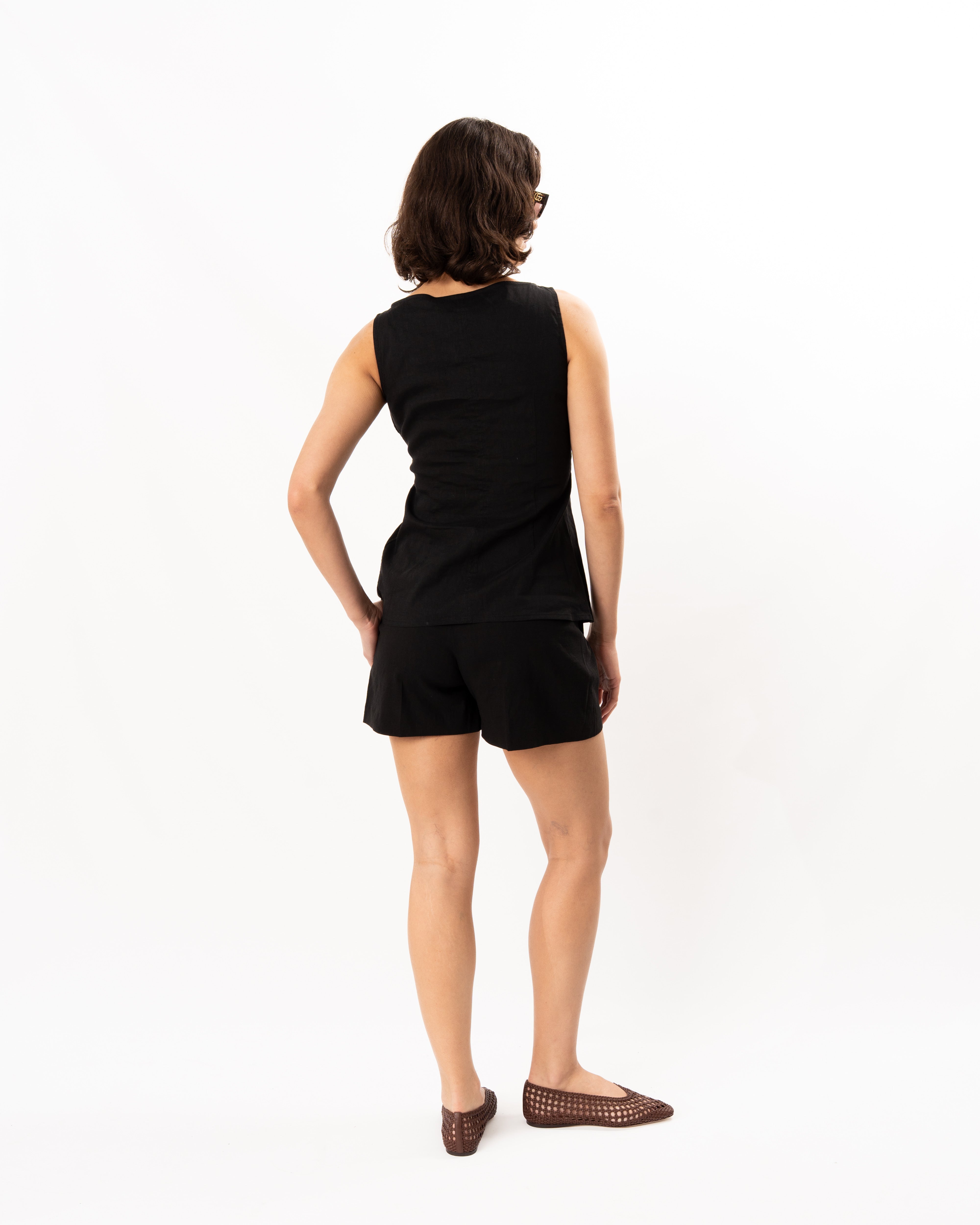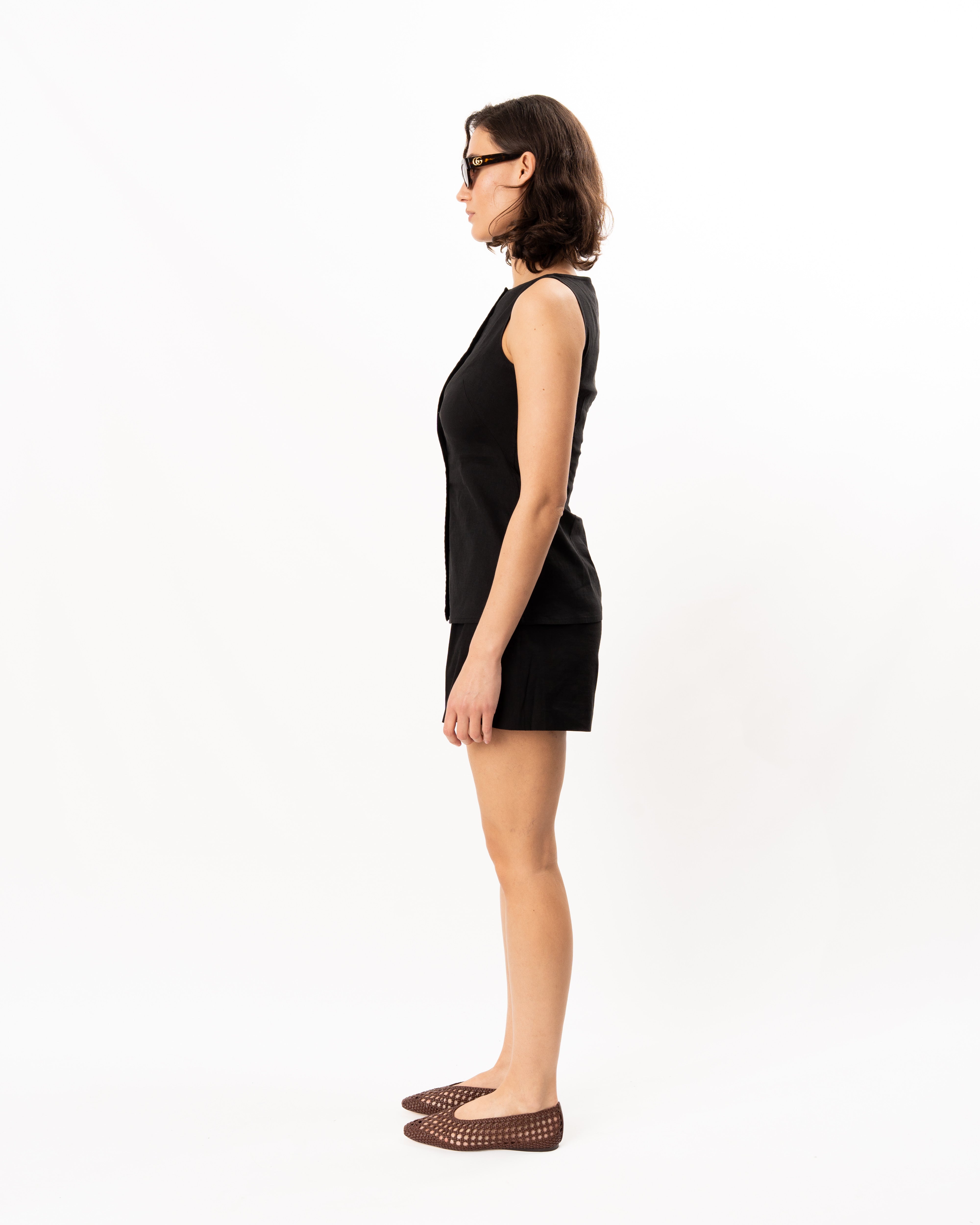 This sleeveless top is detailed with a wide boat neckline. Buttoned up the front, the silhouette slightly cinches at the waist and cuts away at the hem. It’s cut for a slim, tailored fit that pairs well with shorts, denim, or a dress pant. Crafted in stretch Good Linen for all-day ease.