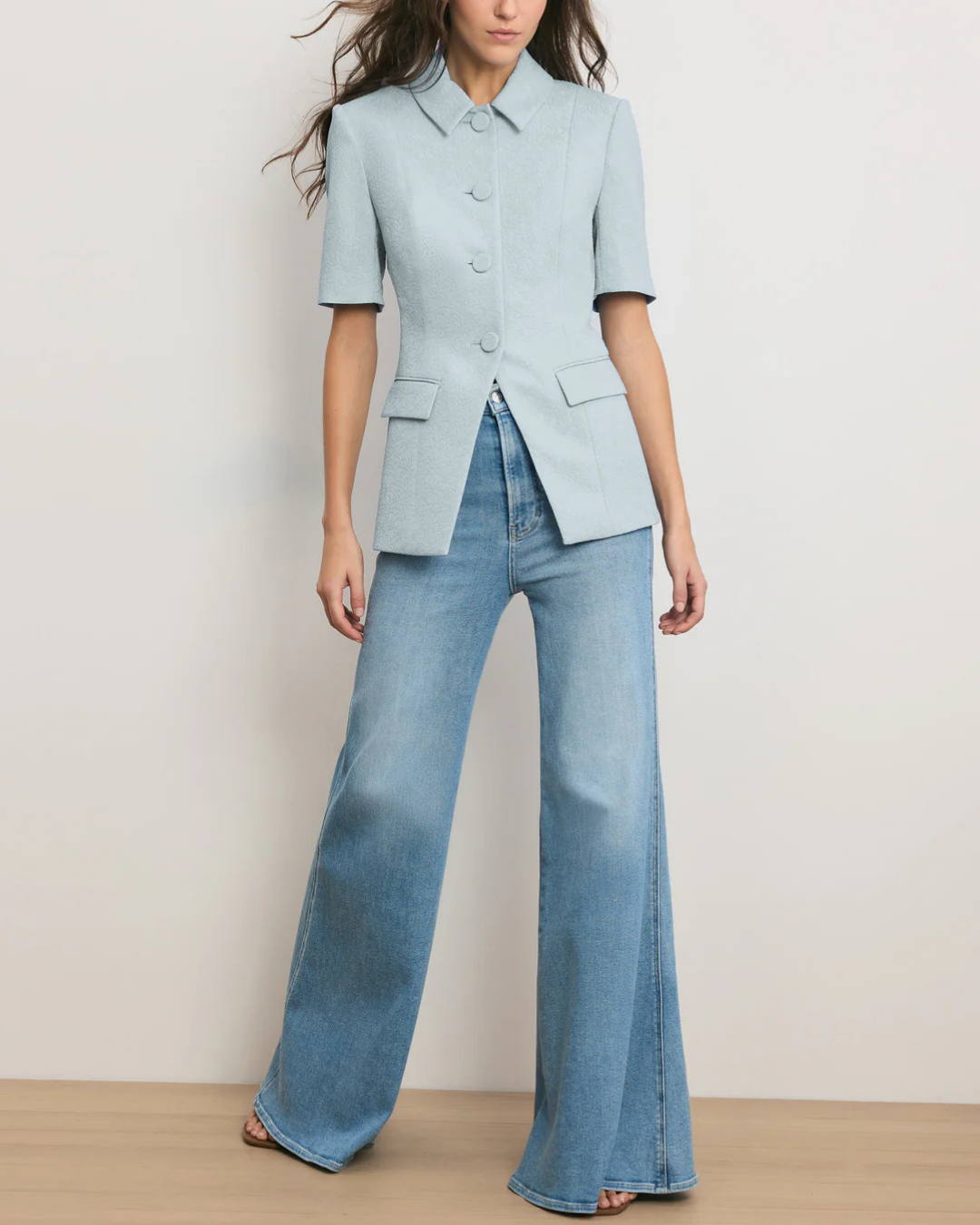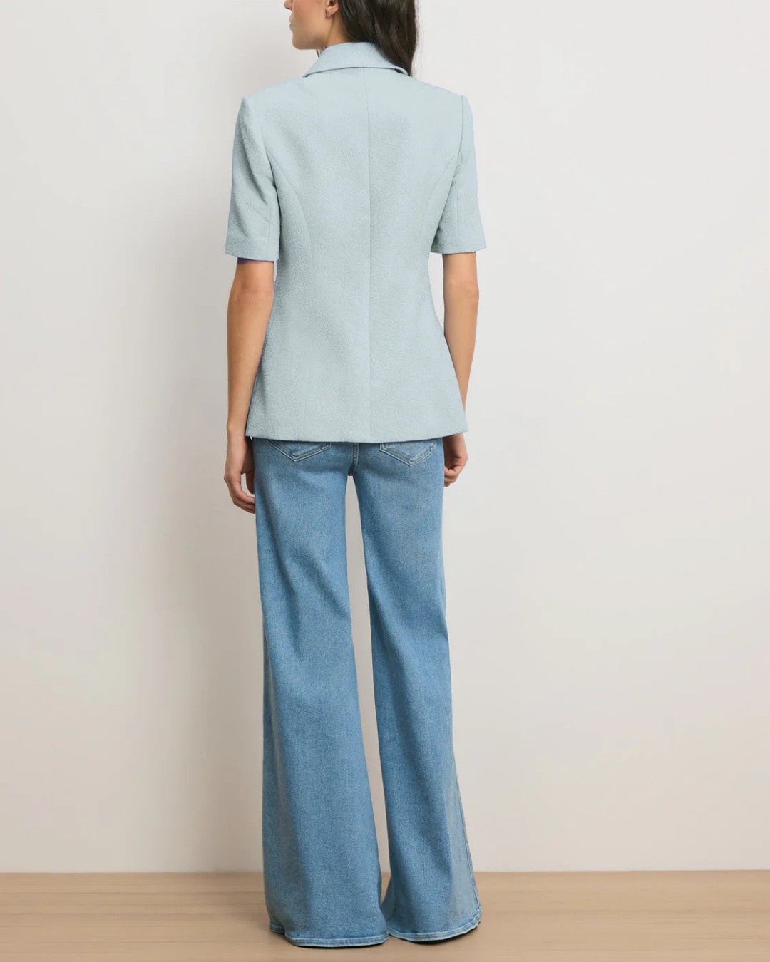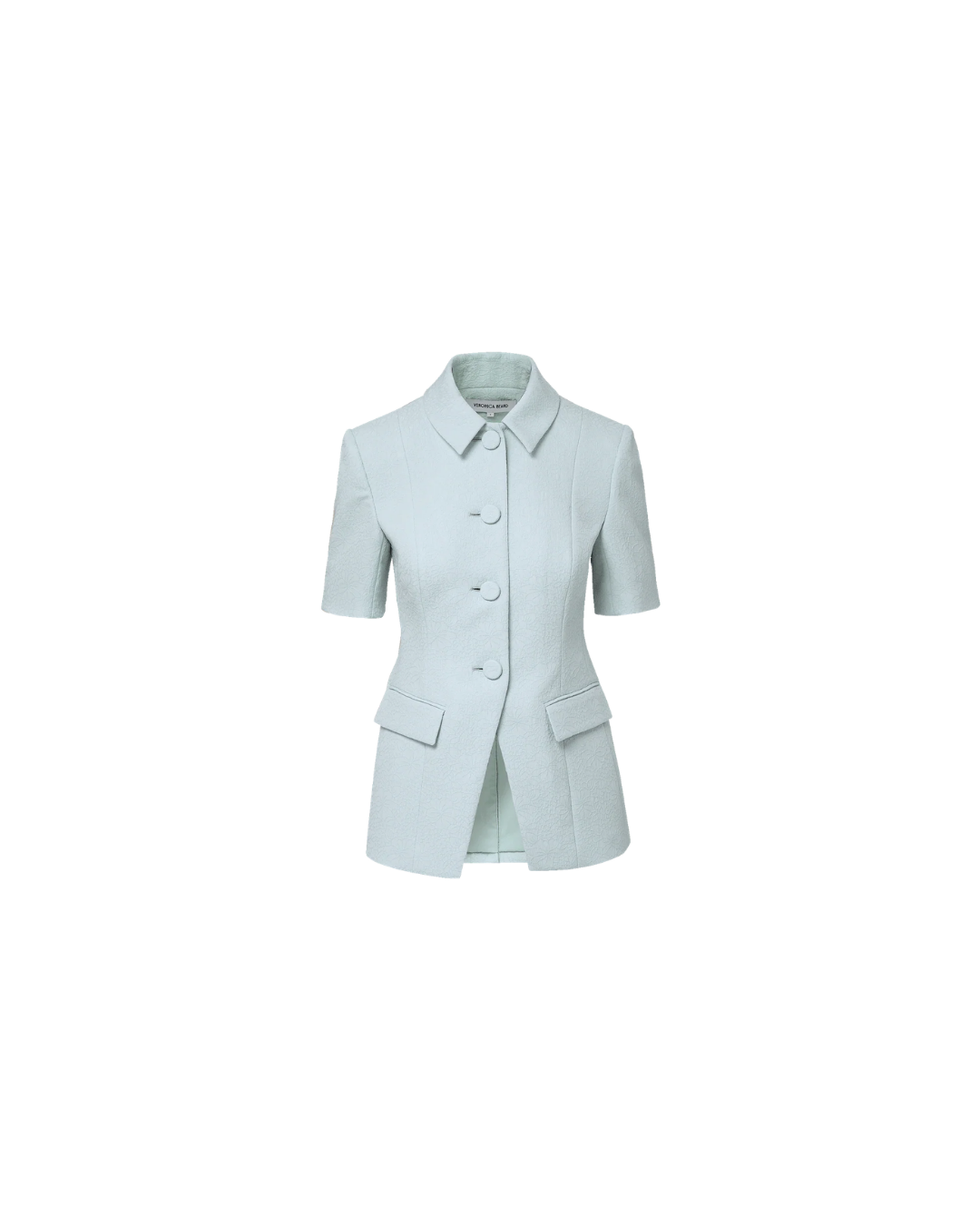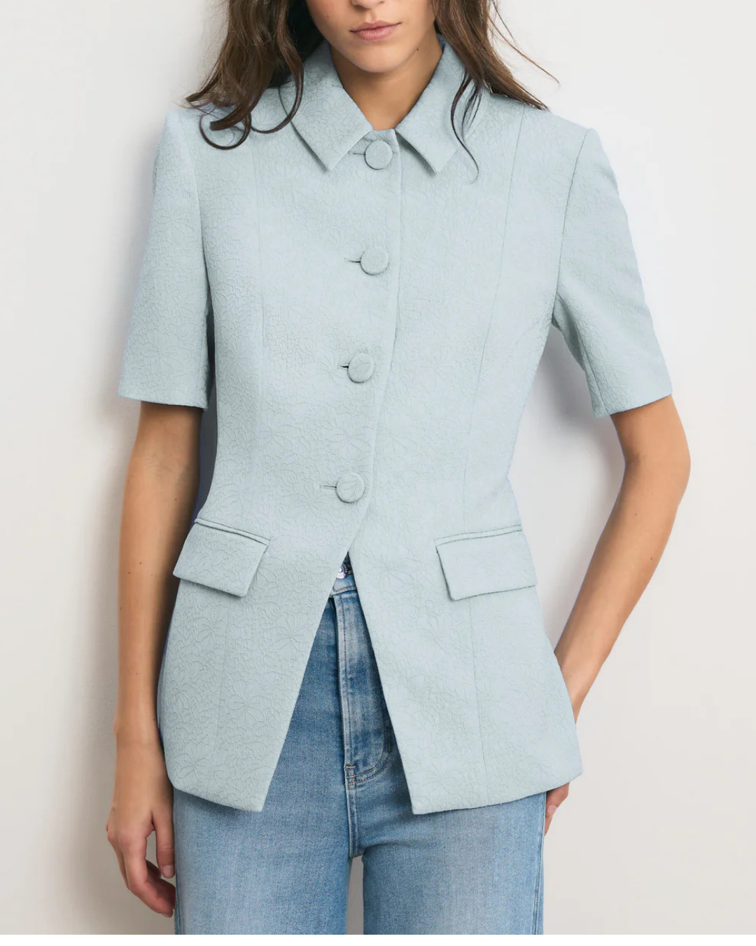 Impeccably tailored in light-blue floral-textured jacquard, the Bodie is a structured quarter-sleeve jacket designed with an elongated, slim-fitting silhouette. Vertical darting at the waistline and a cutaway hem enhance shape, while a pointed collar, front flap pockets, and self-covered buttons complete the look. Style with the coordinating pant for a modern take on suiting, or denim for a more casual feel.