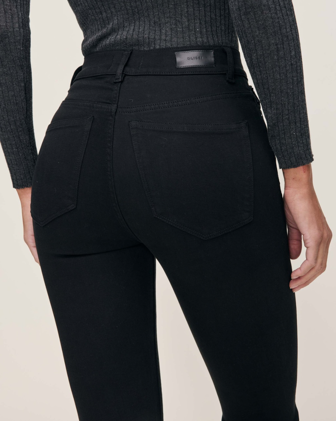 Hail is a no-fade black wash denim. It features black oxide hardware, tonal stitching, a clean hem and a black back patch.