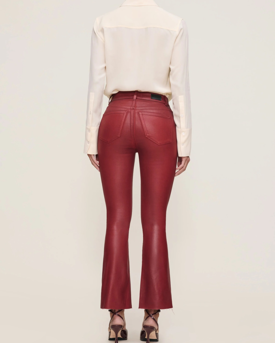 Cherry Coated is a wax coated, classic red denim with a leather-like look. It features silver hardware, tonal stitching, a raw hem and an ecru back patch.