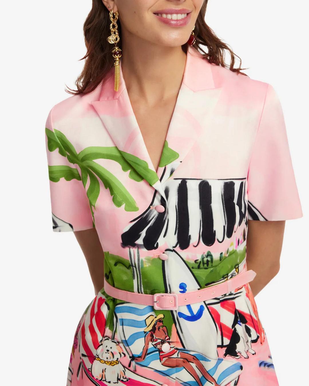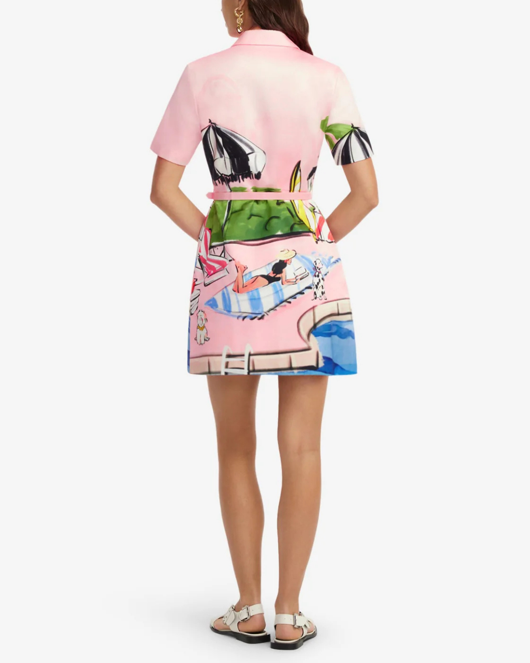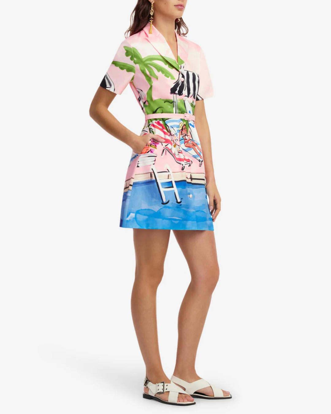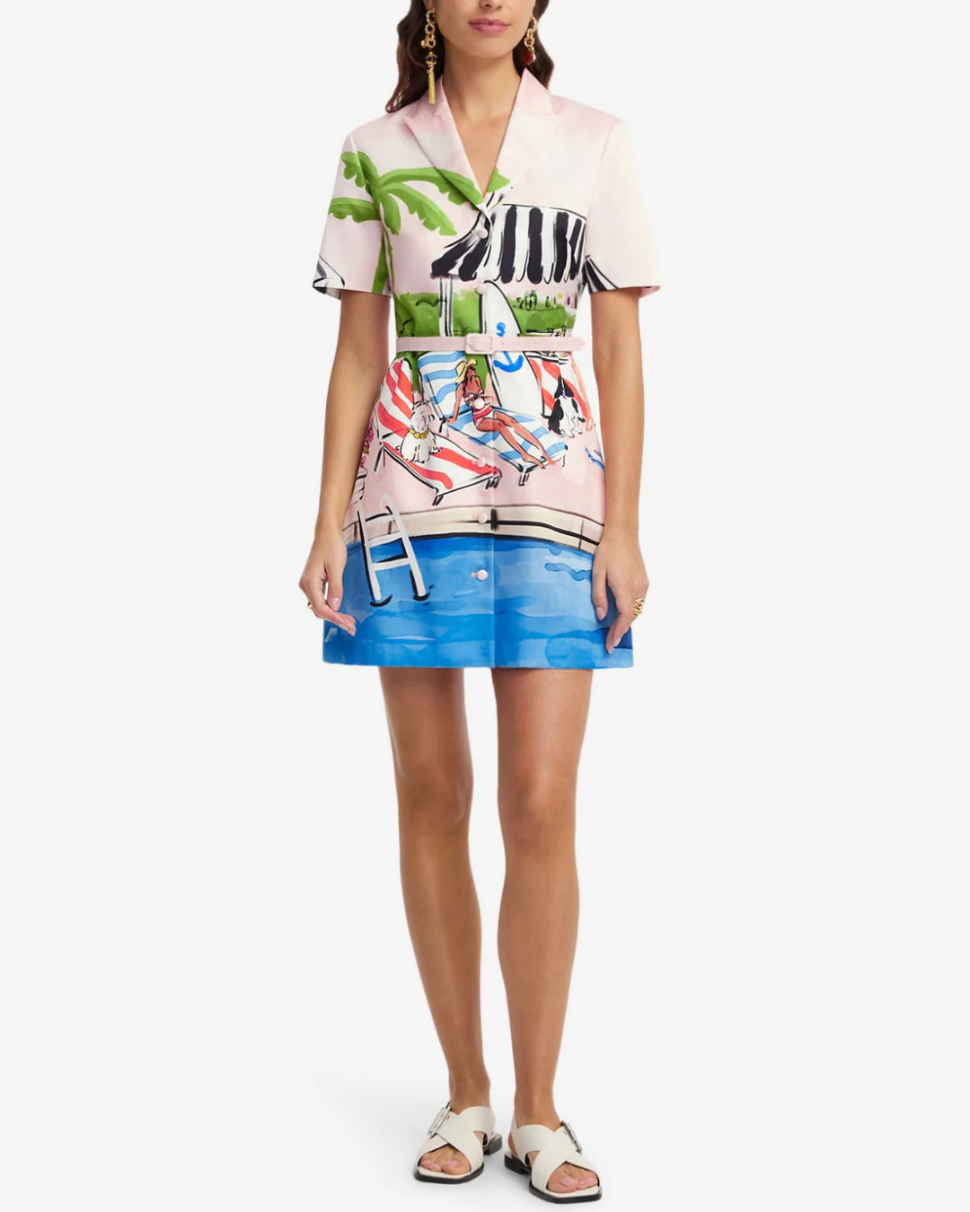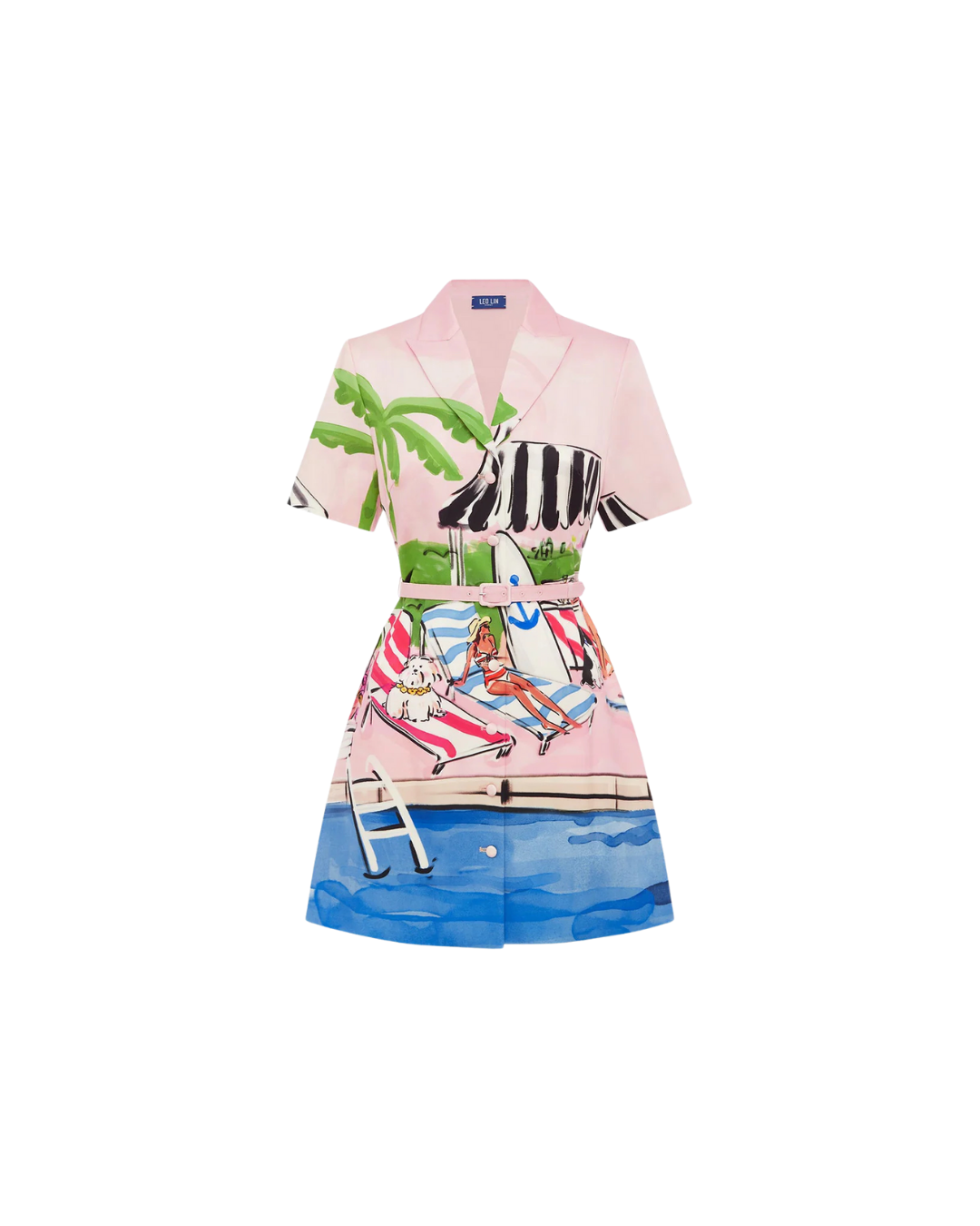 This charming, hand-sketched resort scene is a dreamy European holiday in fabric form. Complete with poolside glamour and playful accents, this print is bright, nostalgic, and fun. Say bonjour to summer!