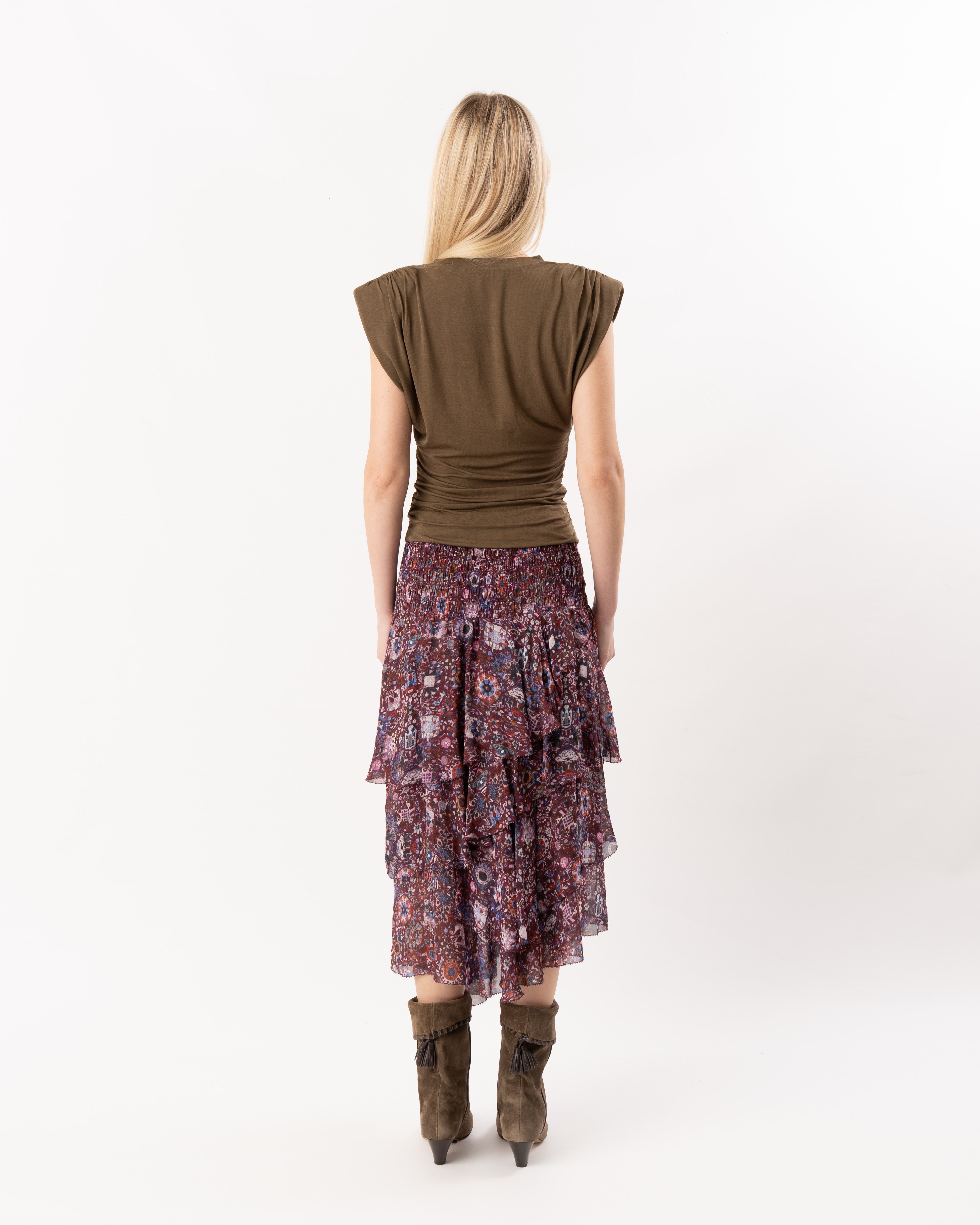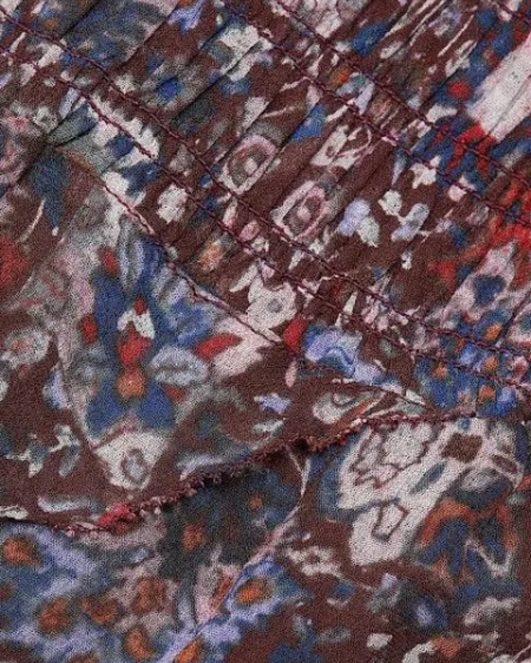 The Brigitte Skirt features a delicate georgette fabric adorned with a charming tapestry print. Its elastic, smocked waist ensures a comfortable fit, while rows of frills add playful movement. The pointed asymmetrical hem and plain-colored crepe bottom create a sophisticated contrast, and the flared, flowing cut flatters from the fitted waist for an effortlessly stylish silhouette.