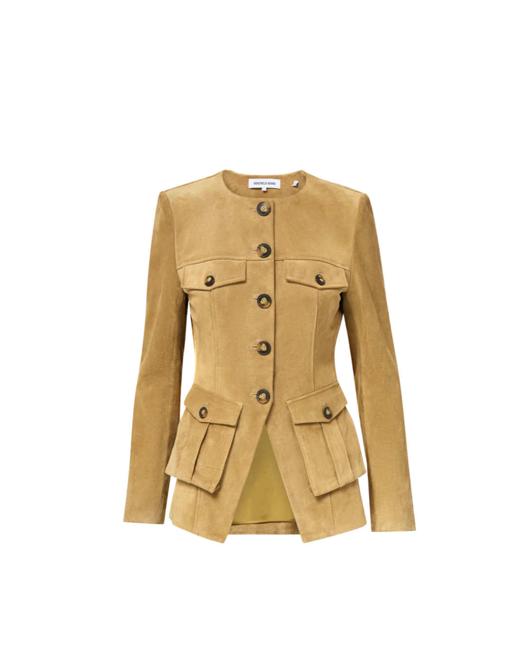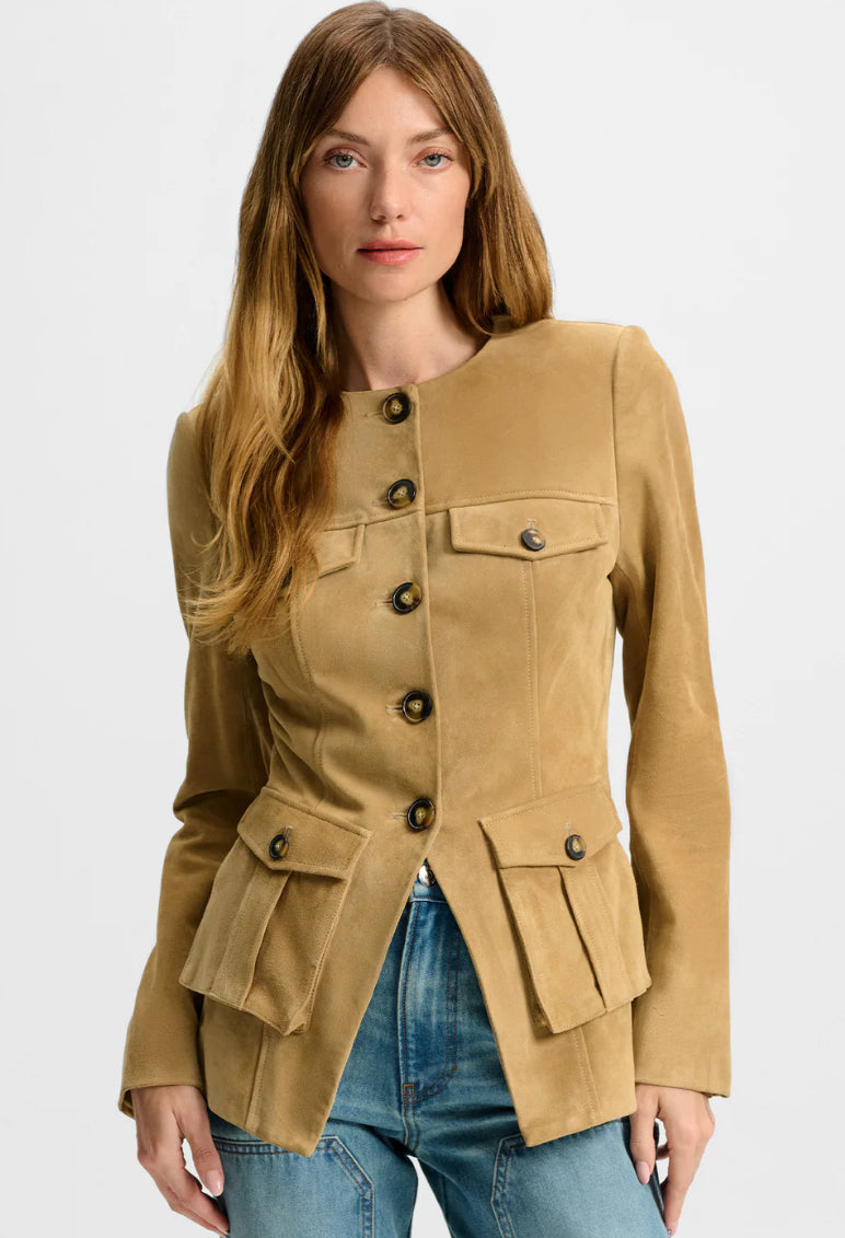 Sleek and polished, Orrin is a slim-fitting, elongated jacket with a utilitarian edge. Crafted from butter-soft Italian calfskin, it features a collarless crew neckline, front flap pockets, and an angled cutaway hem for a lengthening effect. Style it closed as a top, or layer open over cotton tanks and lightweight knits.