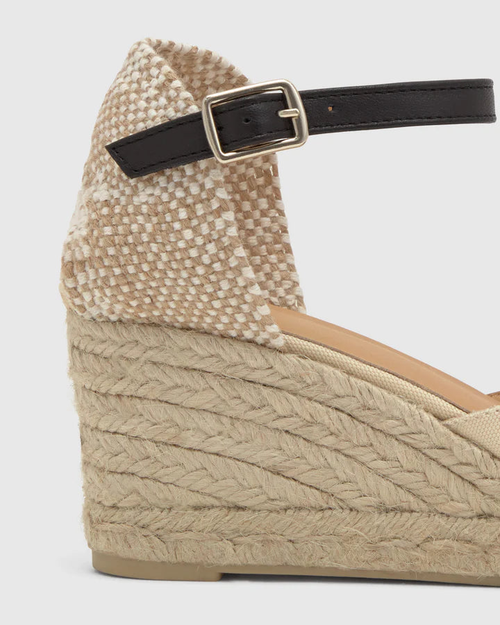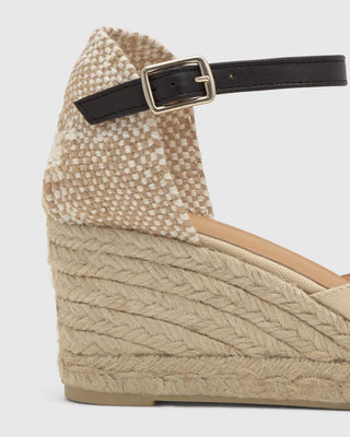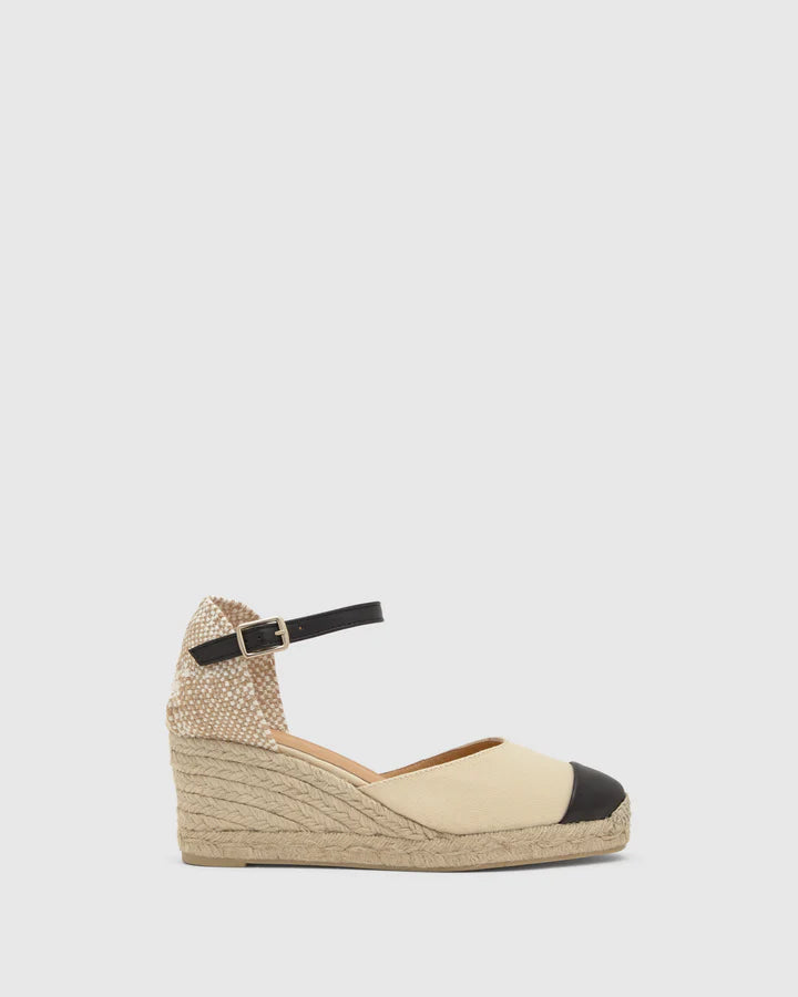 The Coraline espadrille offers a blend of style and sustainability. Made from organic cotton, it features a buckle closure, a leather toecap for added durability, a cushioned insole for comfort, and a 7cm jute wedge for a timeless, elevated look. Perfect for effortless summer chic with an eco-friendly twist.