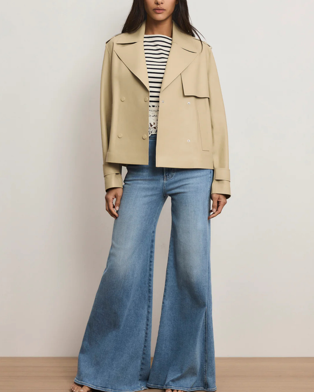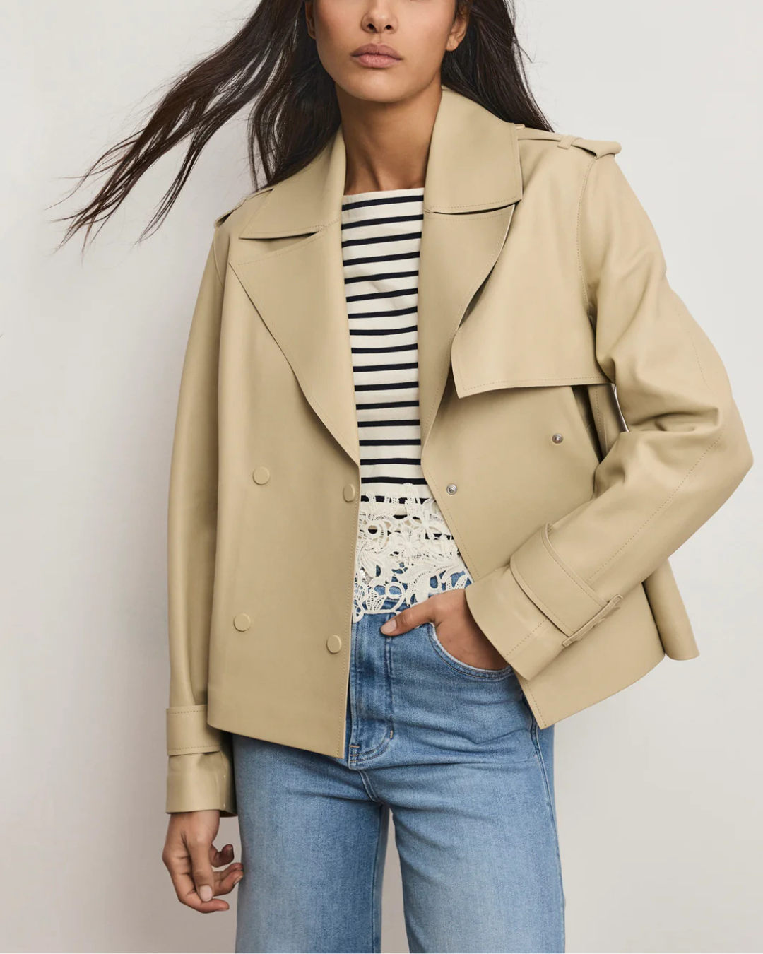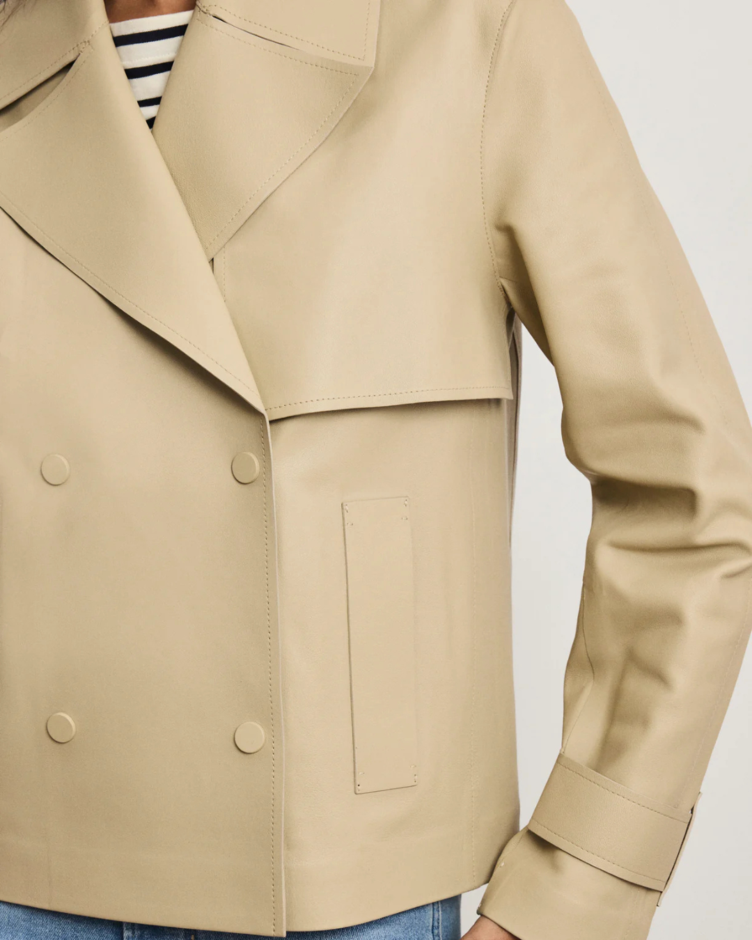 Made from 100% supple lambskin leather, the Heathcliff reimagines the classic trench coat with a cropped, modern edge. In muted khaki, its boxy, double-breasted silhouette features a notch lapel, traditional back storm flap, wide slip pockets, and tonal sleeve belts. A cool, elevated take on a wardrobe staple, this cropped trench layers effortlessly over everything.