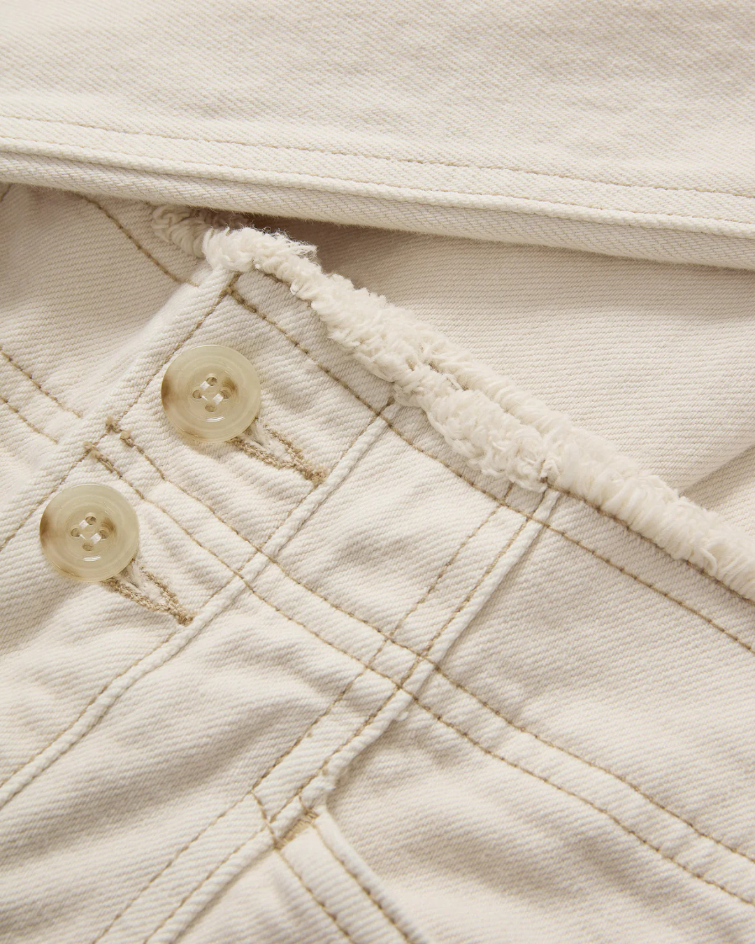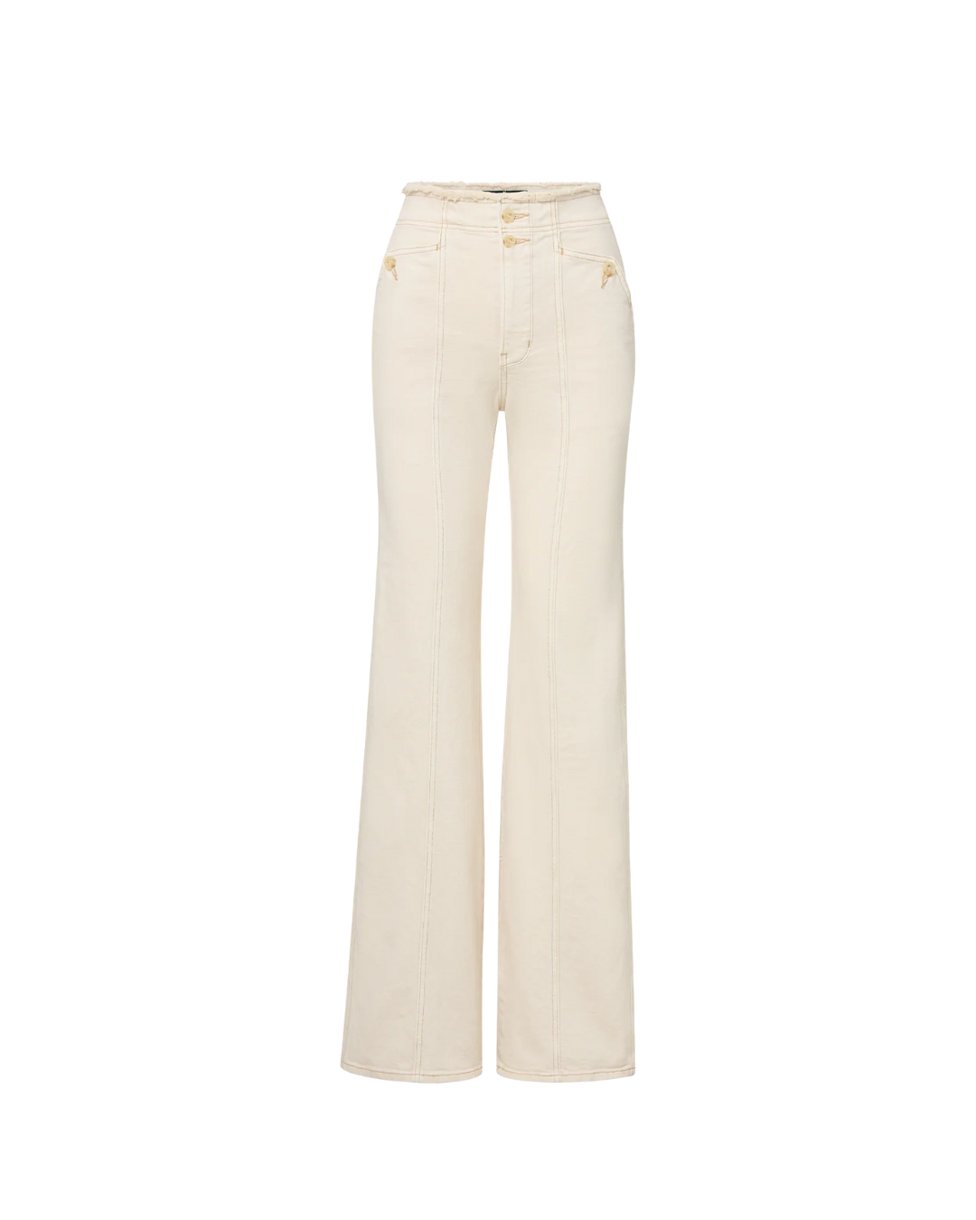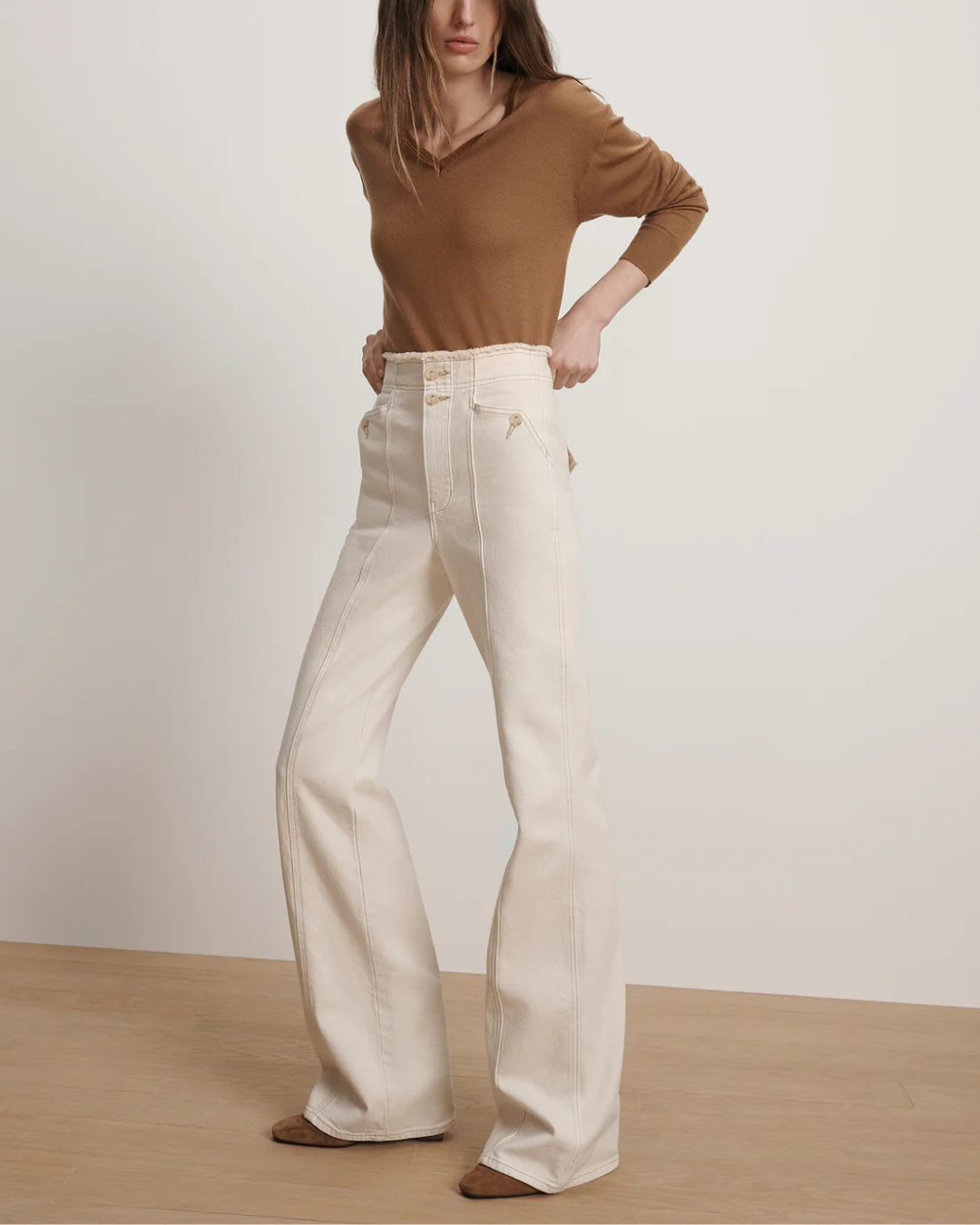 The Crosbie you know and love—now reimagined with angled welt pockets, front seams, and a raw-edge waistband. Made in LA from premium Italian denim, this white high-rise, slimmed-out wide-leg jean is fitted through the hips and thighs and expertly tailored for an elongating effect. Our signature V belt loops complete the look. For an elevated take on casual-chic, we love pairing it with a simple T-shirt and boots.