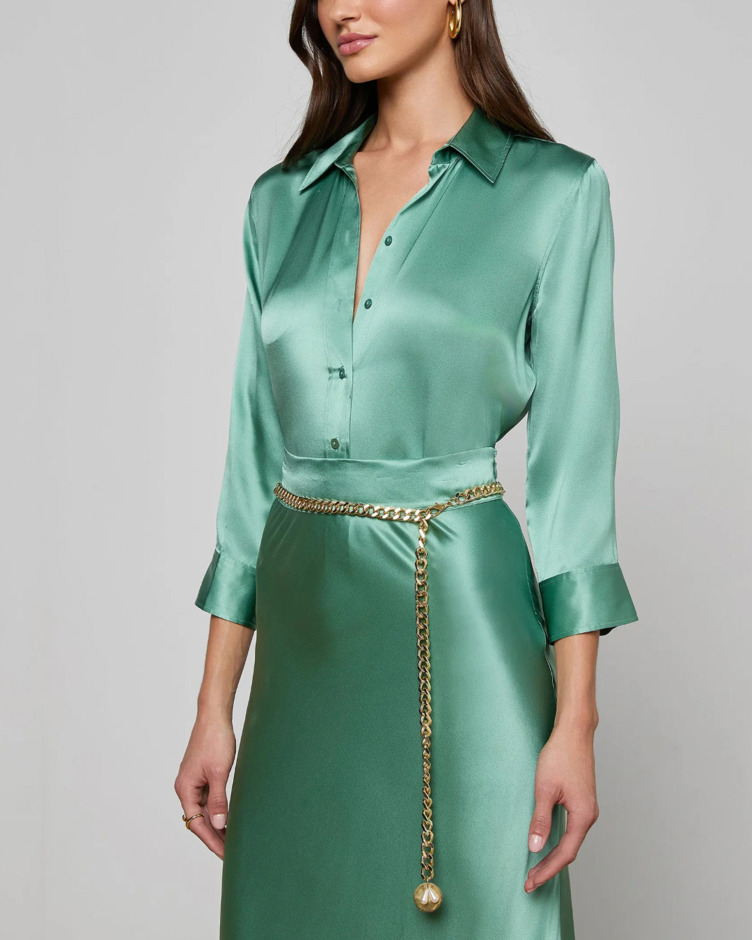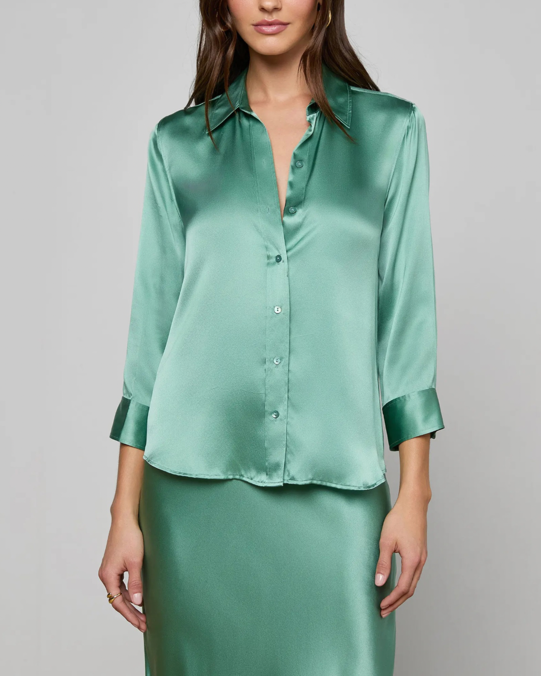The iconic silk button-down that belongs in every wardrobe. This all-time bestseller is constructed with three-quarter length sleeves designed to perfectly showcase your jewelry—no sleeve rolling required. Our signature Dani blouse is back in a soft malachite green.