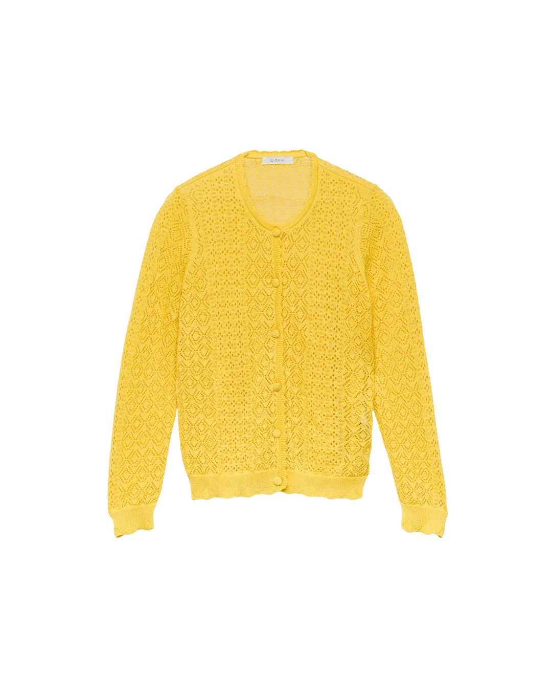 The Diane Cardigan is crafted from a lightweight, slightly sheer viscose blend with a delicate allover pointelle design inspired by Victorian-era bobbin lace. The Diane features a classic crew neck and bracelet-length sleeves, finished with crocheted buttons and scallop edge ribbing at the neckline, sleeve cuffs, and hem.