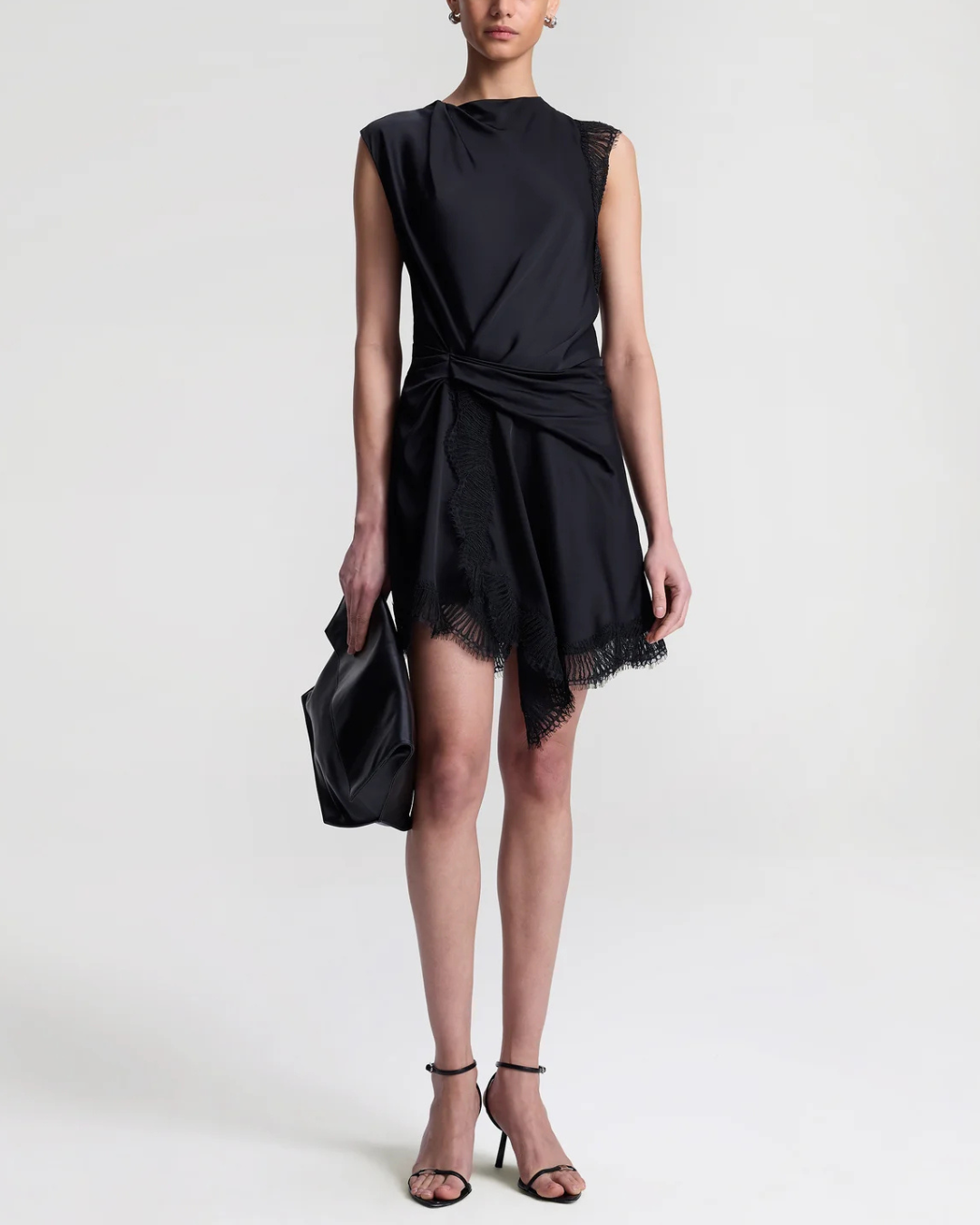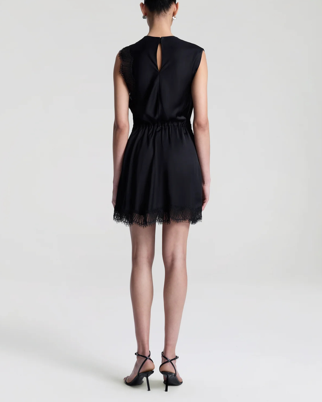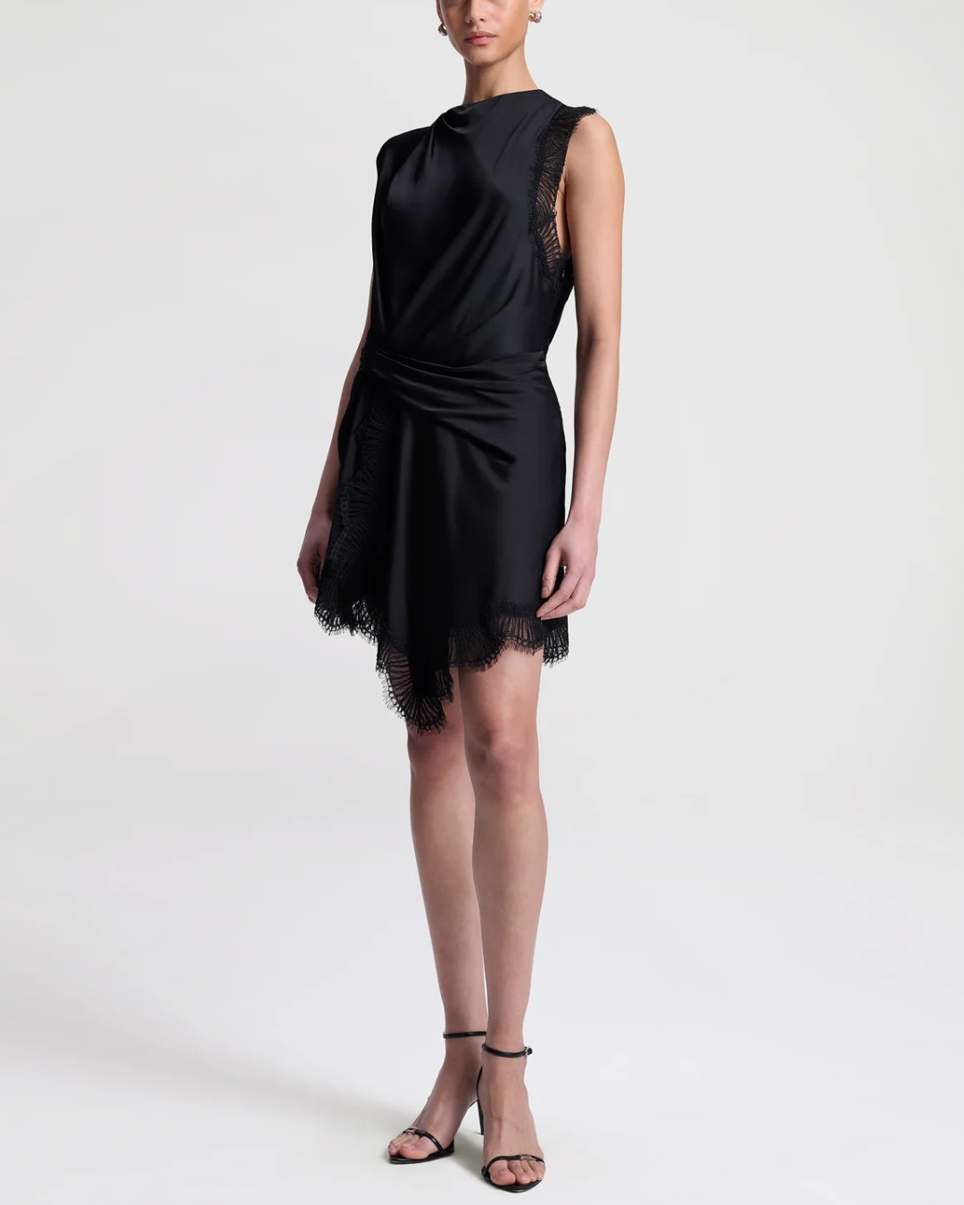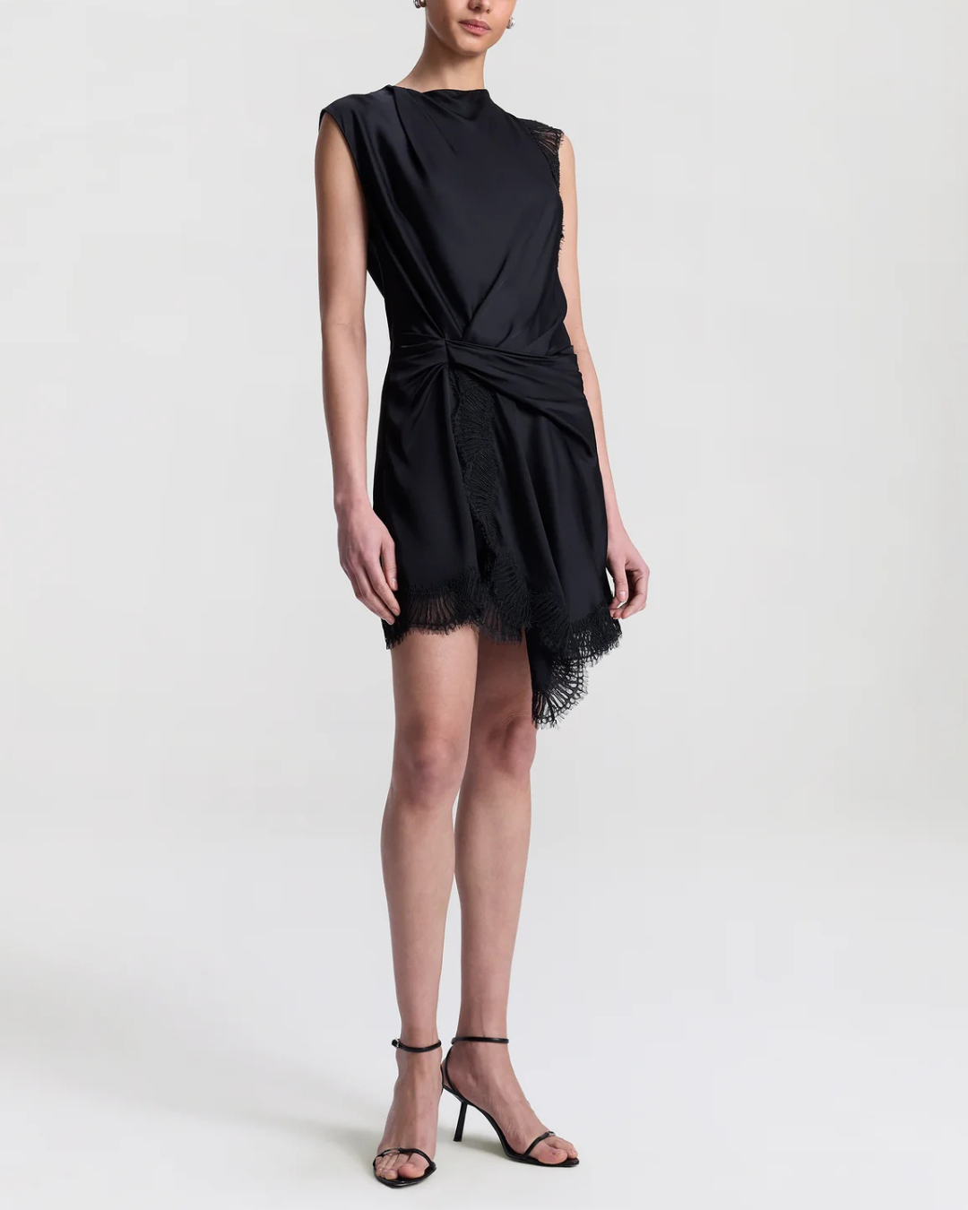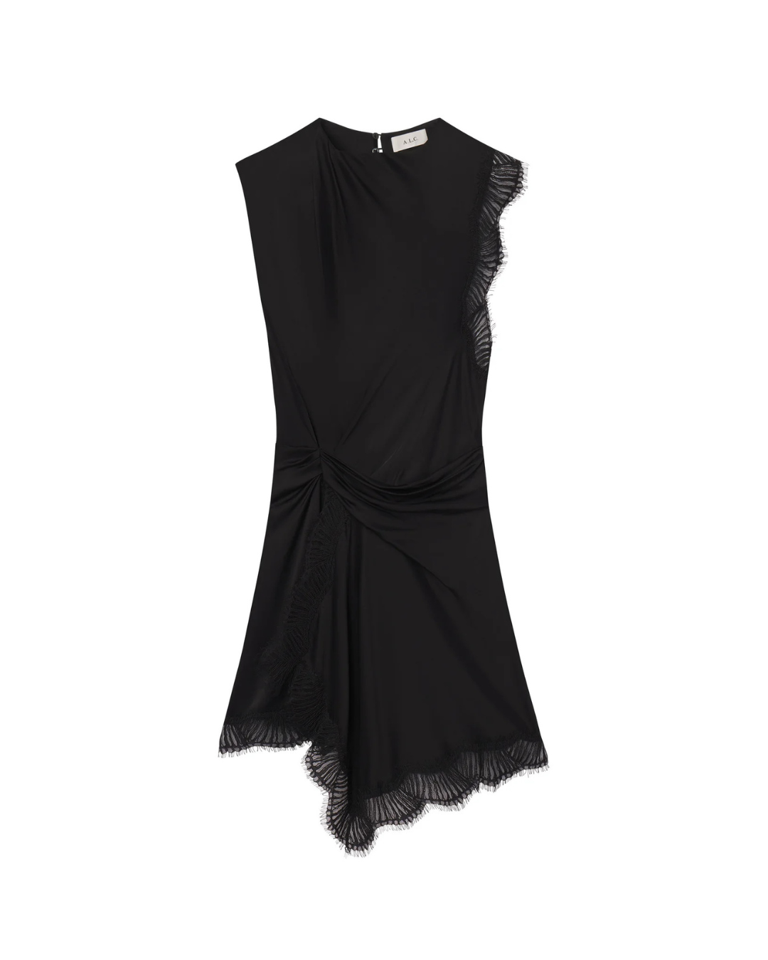 The Dion Dress is crafted from fluid black viscose and trimmed with tonal eyelash lace. This sleeveless mini silhouette features artful draping across the neckline and a gathered waist that flows into an asymmetrical hem. Lace detailing along one arm and the hem adds a subtle dose of texture and contrast, while a back keyhole with hook-and-eye closure completes the look. We recommend sizing down for a more tailored fit.