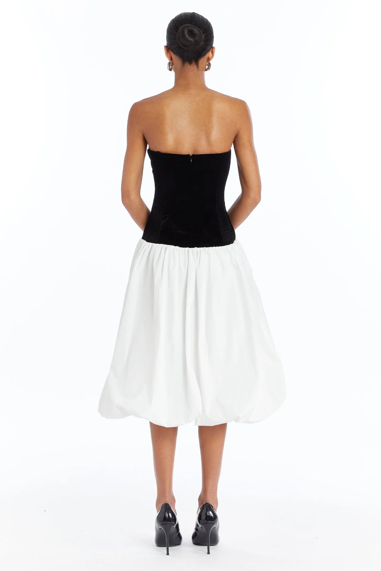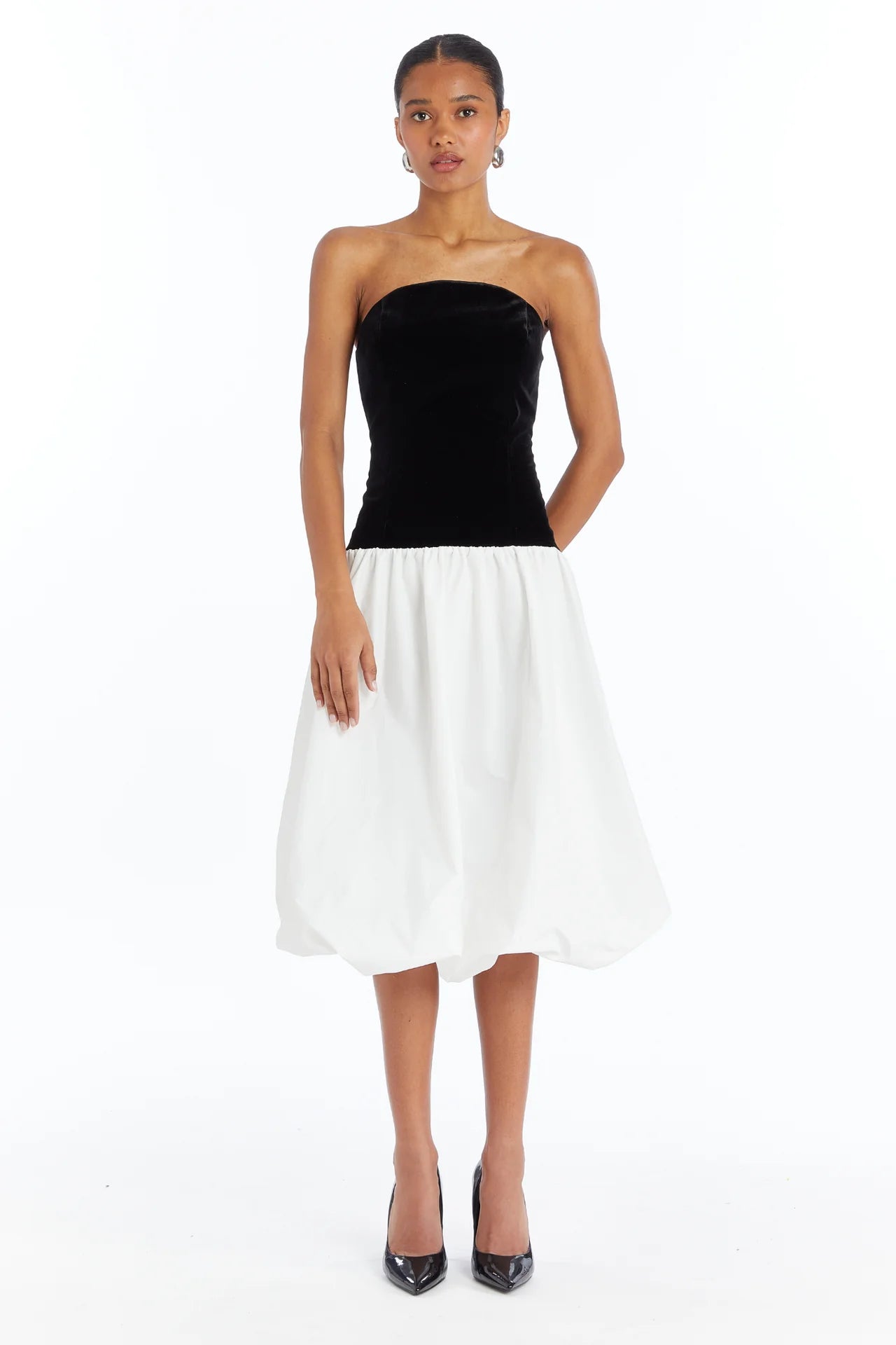 Make tonight count in the Valencia Bubble Dress, designed to turn heads with timeless charm. This strapless midi features a contemporary drop waist that flows into a voluminous bubble skirt that adds a hint of fun. Perfect for special occasions, complement the neckline with a delicate necklace and finish with sleek heels.