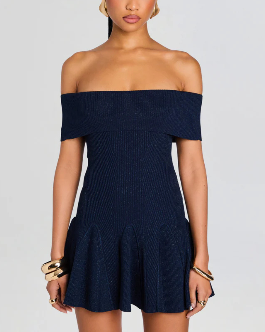 Introducing the Erica Dress, the epitome of girly sophistication with a touch of flair. Elevate your wardrobe with this charming piece that seamlessly combines feminine details, and timeless elegance. Crafted from knit fabric, this mini dress offers a figure-flattering bodycon fit that hugs your curves in all the right places. The off-the-shoulder neckline adds a flirty and feminine touch, while the flare at the end adds a hint of movement and charm. Shown here in Metallic Navy.