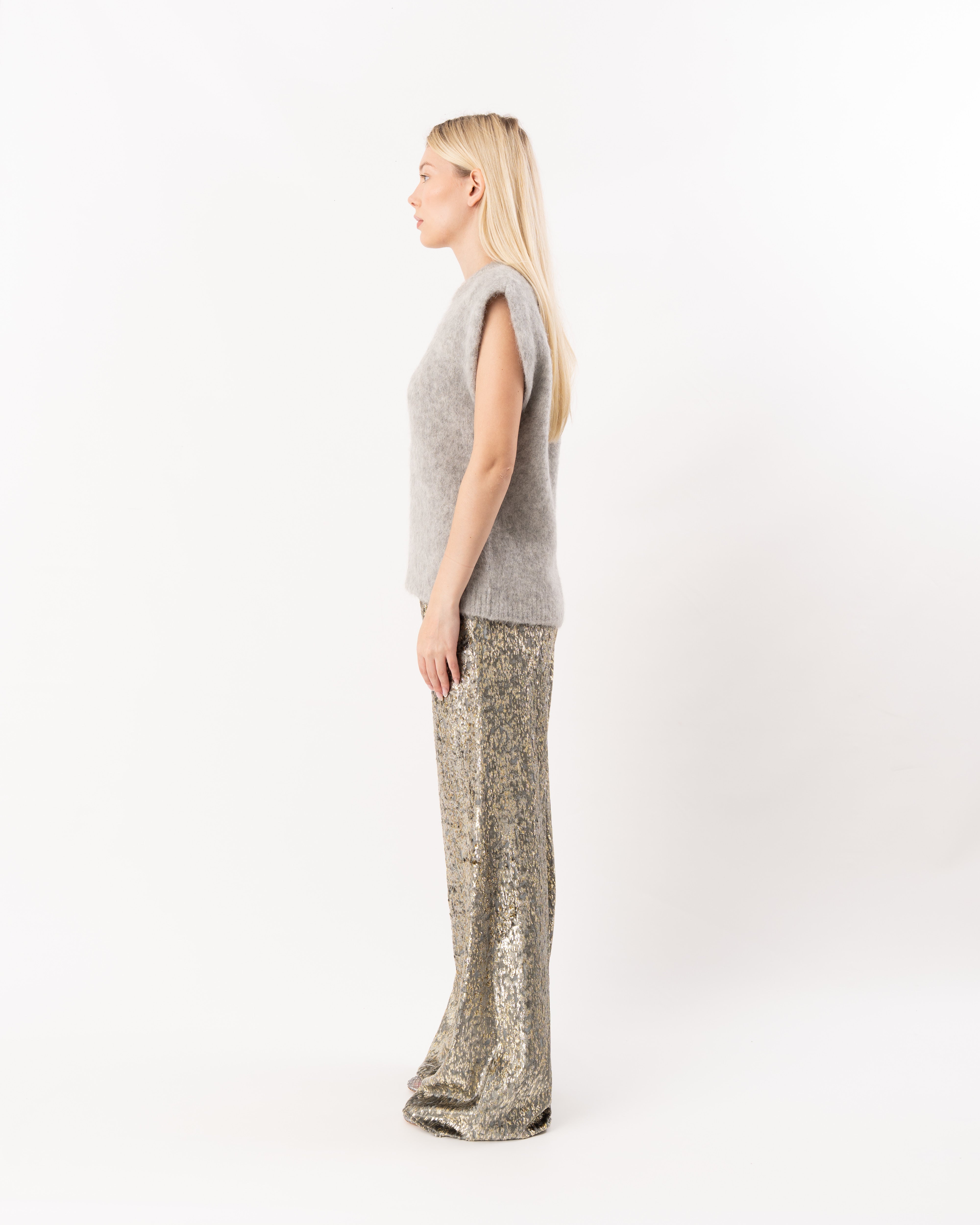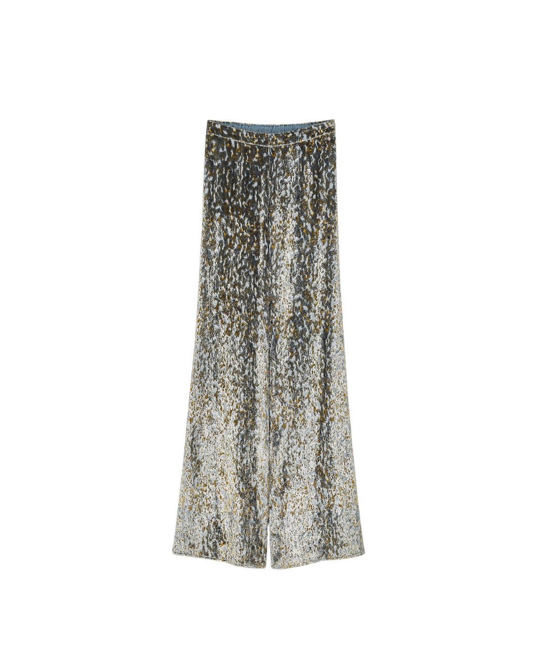 with a fluid naturally elegant drape, the flared trousers in “en rêve” fil–coupé are doused in a nocturnal palette. the refined silk–and–viscose velvet is warm to the touch and has been embellished with a devoré pattern that gives depth and dimension. the elasticated casing at the back of the waist brings a mellow touch to this signature forte_forte creation.