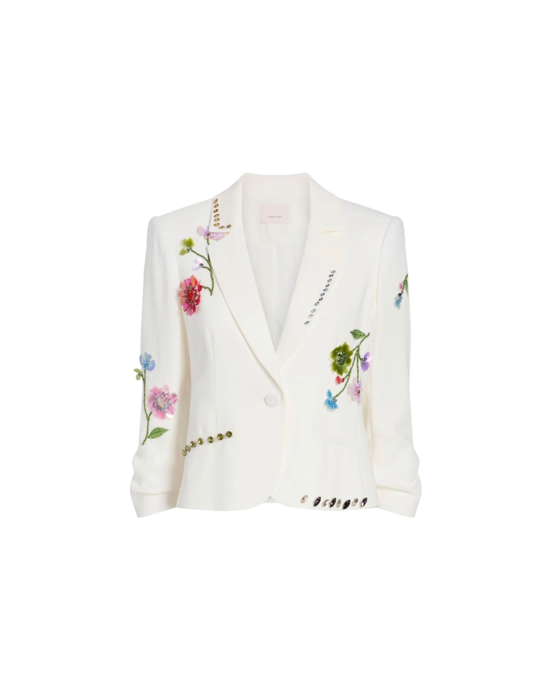 Elevate your wardrobe with this striking floral vine blazer, featuring a sharp notch lapel and button-front closure. The three-quarter sleeves showcase delicate ruched cuffs for added texture and movement. Functional welt pockets keep essentials close, while intricate embellishments and a lined interior deliver both polish and comfort. A versatile layer that transitions seamlessly from office to evening.