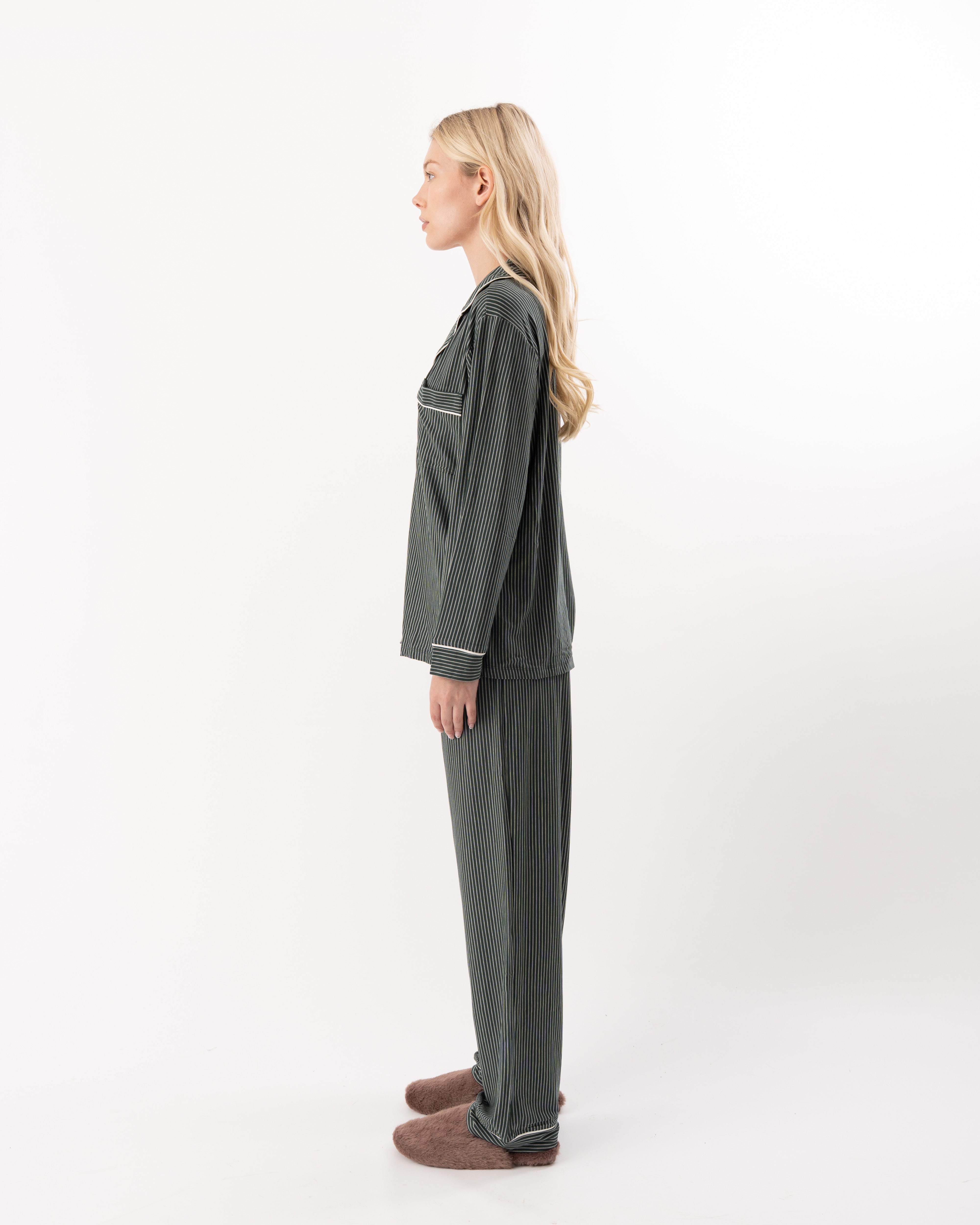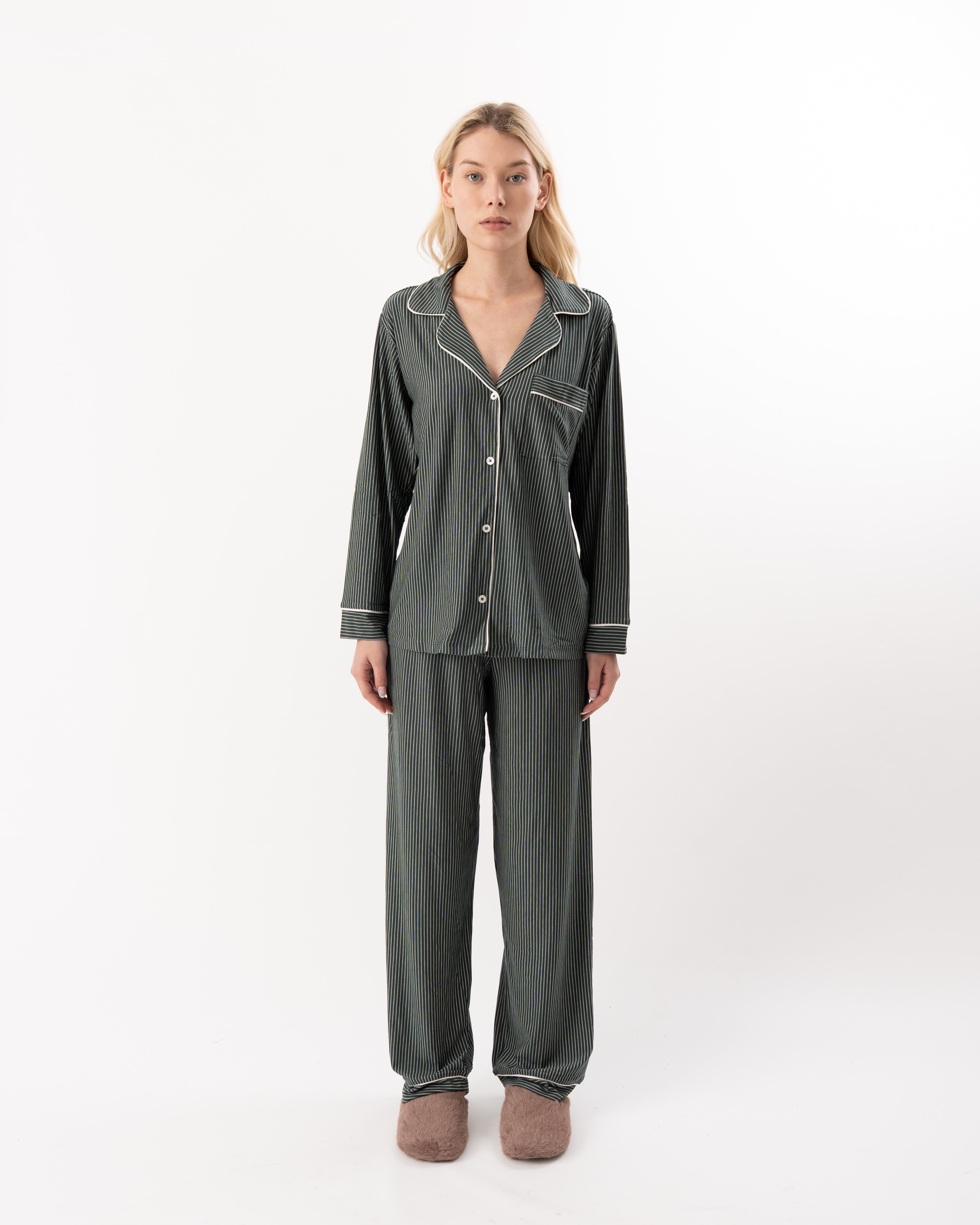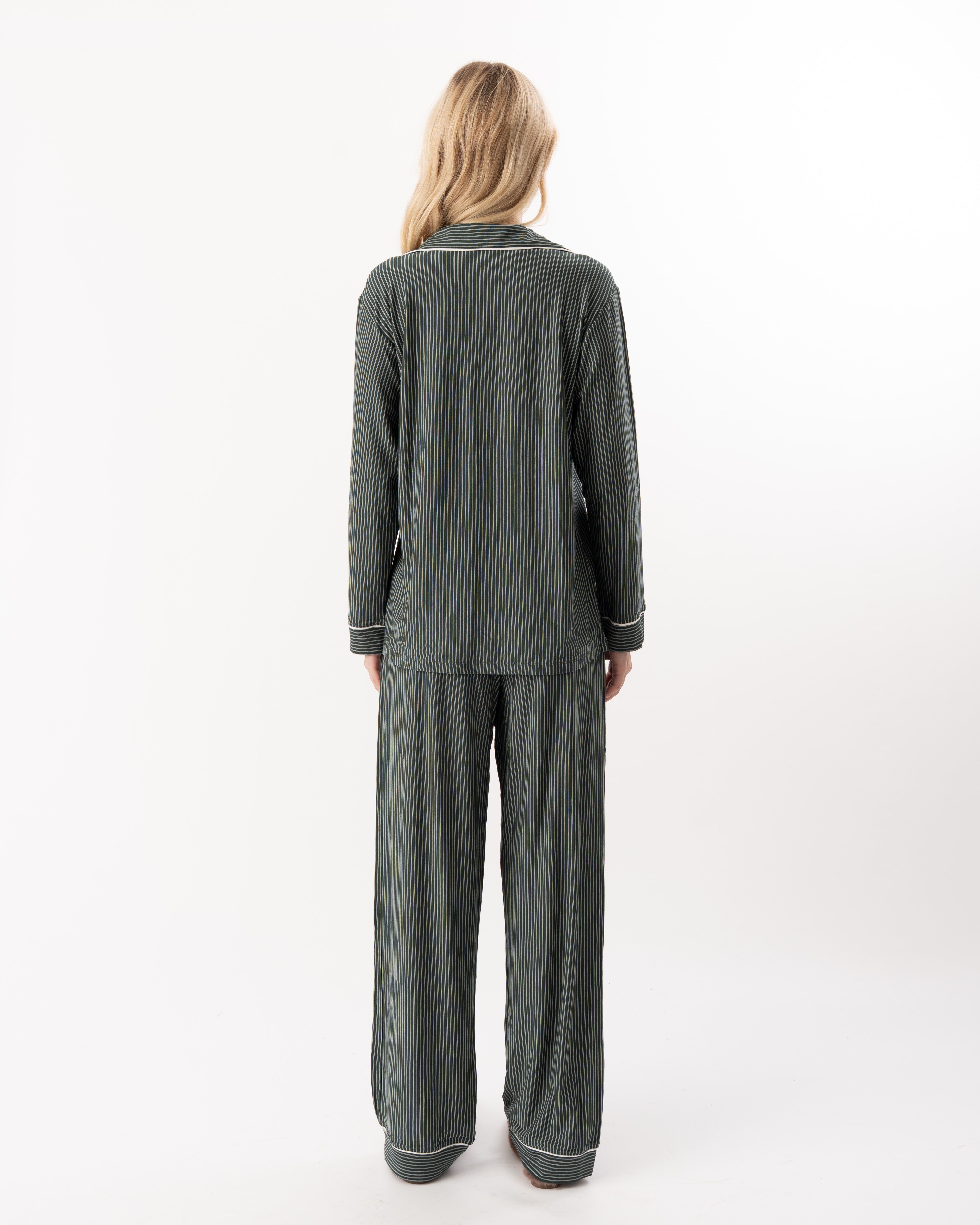 Experience ultimate comfort and style with the GISELE PRINTED LONG PJ SET. Crafted from buttery soft TENCEL™ Modal fibers blended with elastane, this set offers a relaxed fit that moves with you. The fabric is OEKO-TEX® Standard 100 certified, ensuring safe, non-toxic dyes. Featuring contrast piping, a button-front top with a notch collar and functional pocket, plus low-rise straight leg pants with a thin elastic waistband, this set effortlessly combines elegance with coziness for your best nights in.