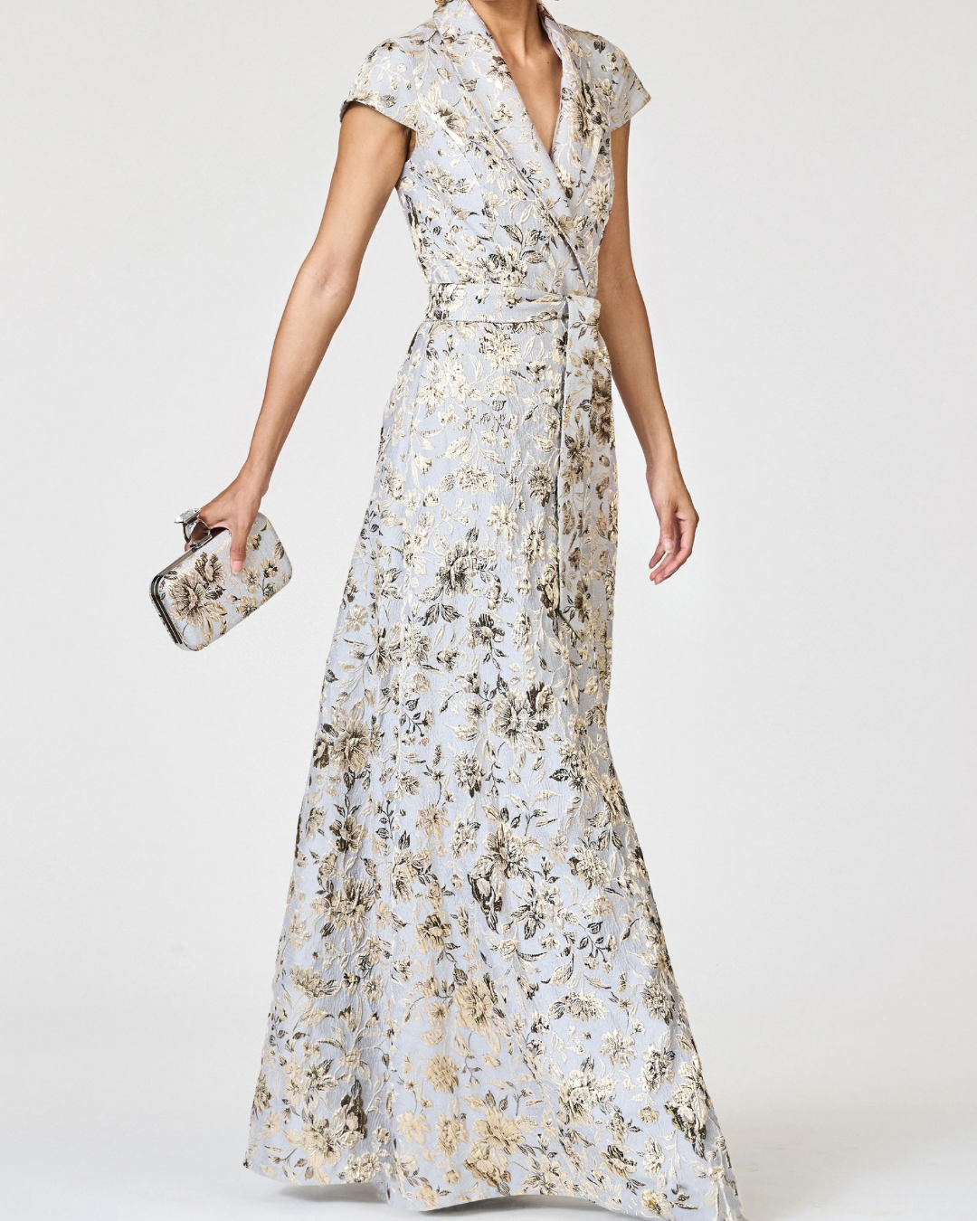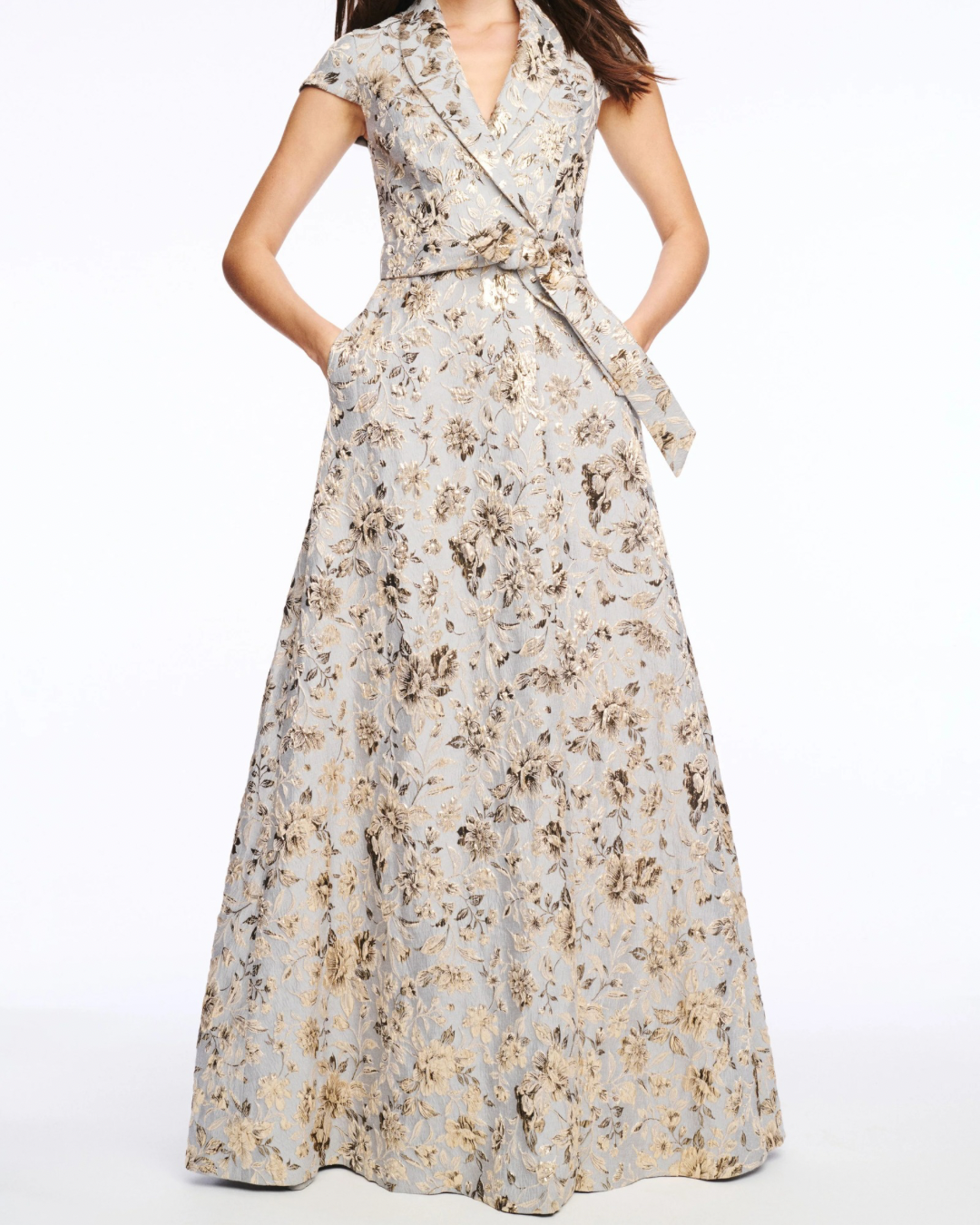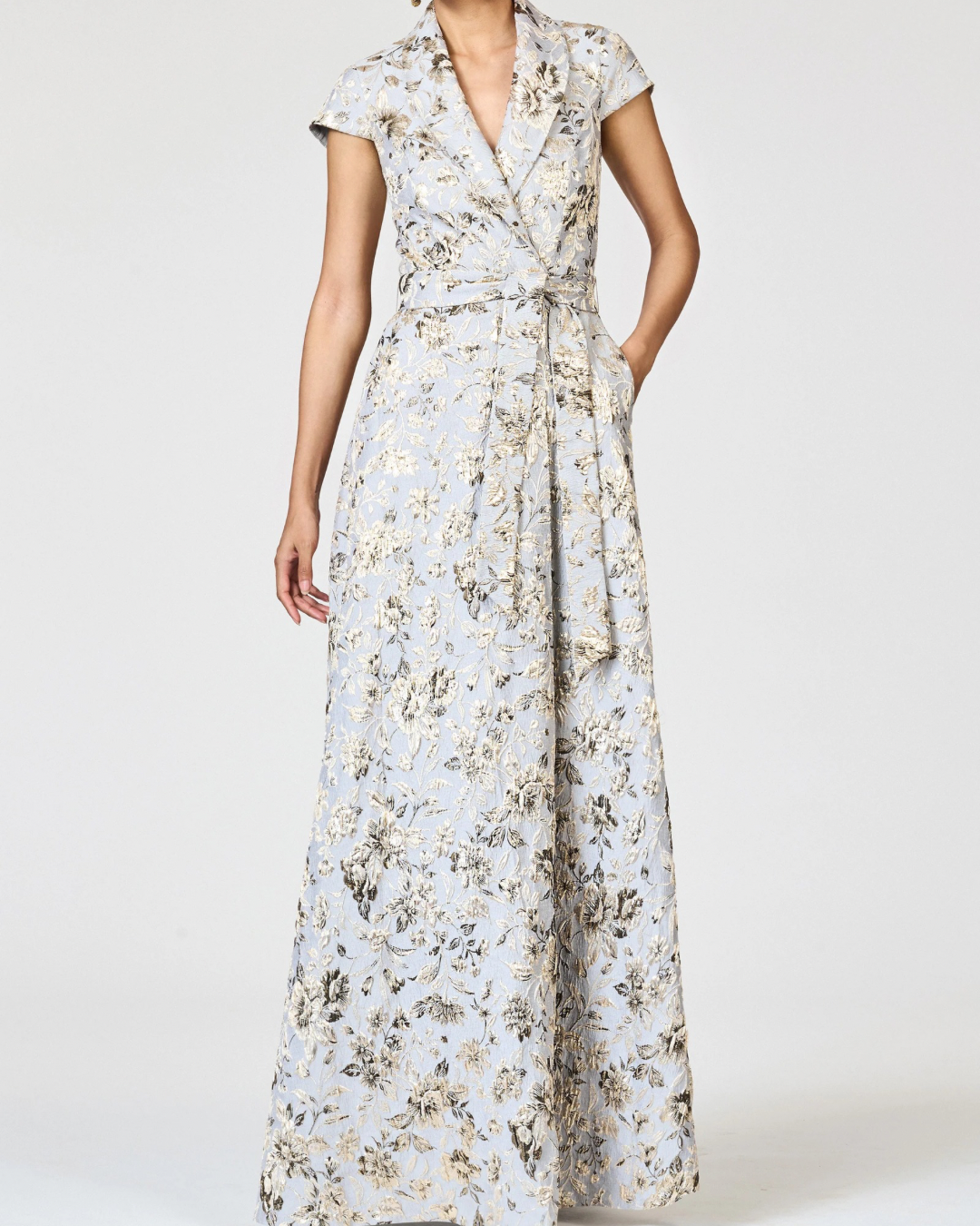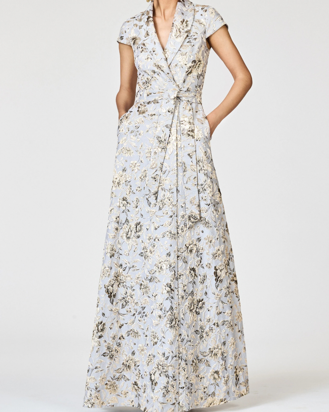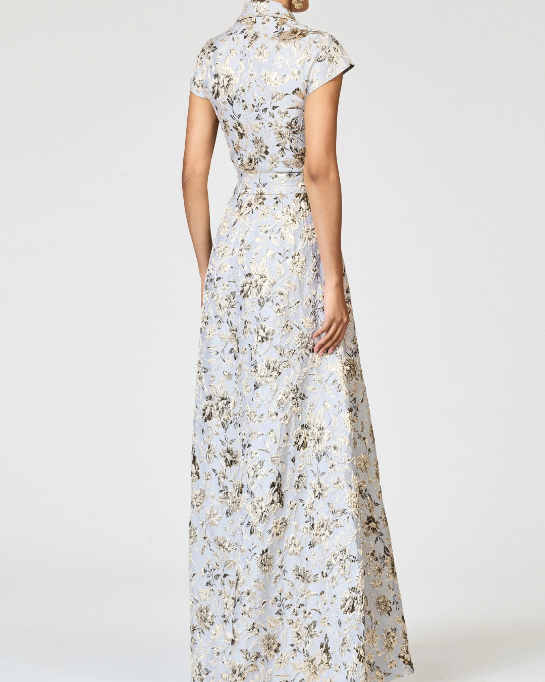The Honora Gown in Golden Gardens print is a refined blend of timeless tailoring and romantic artistry. Crafted in a structured jacquard with a luminous floral motif in gold and pewter tones, it exudes quiet opulence. The shirt-dress inspired bodice features a shawl collar, cap sleeves, and a wrap-front tie belt that cinches the waist with effortless sophistication. A softly structured a-line skirt completes the silhouette with graceful ease. Both polished and striking, Honora is designed for occasions that call for modern elegance and classic charm.