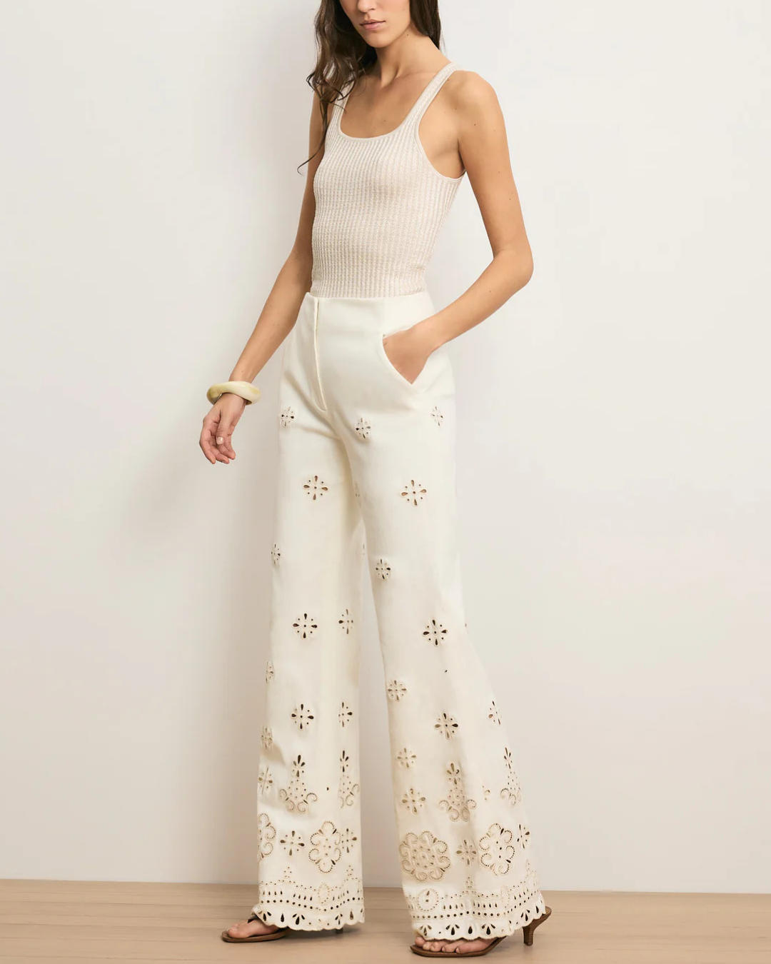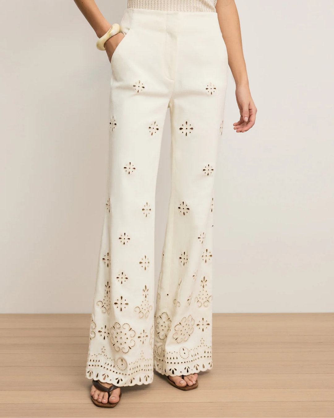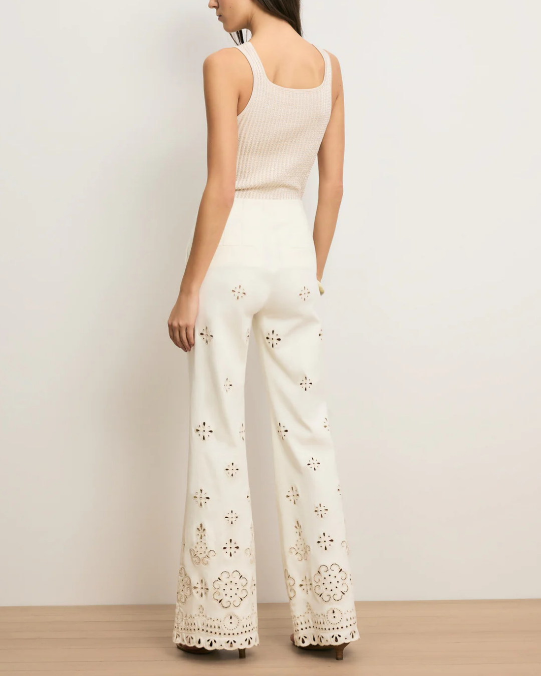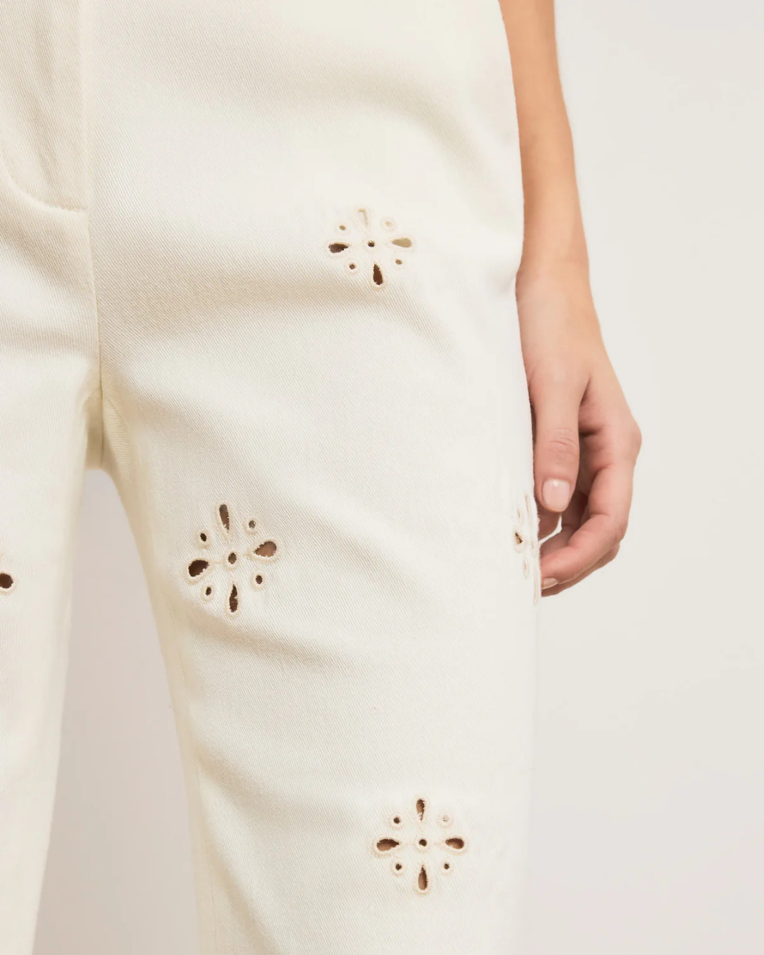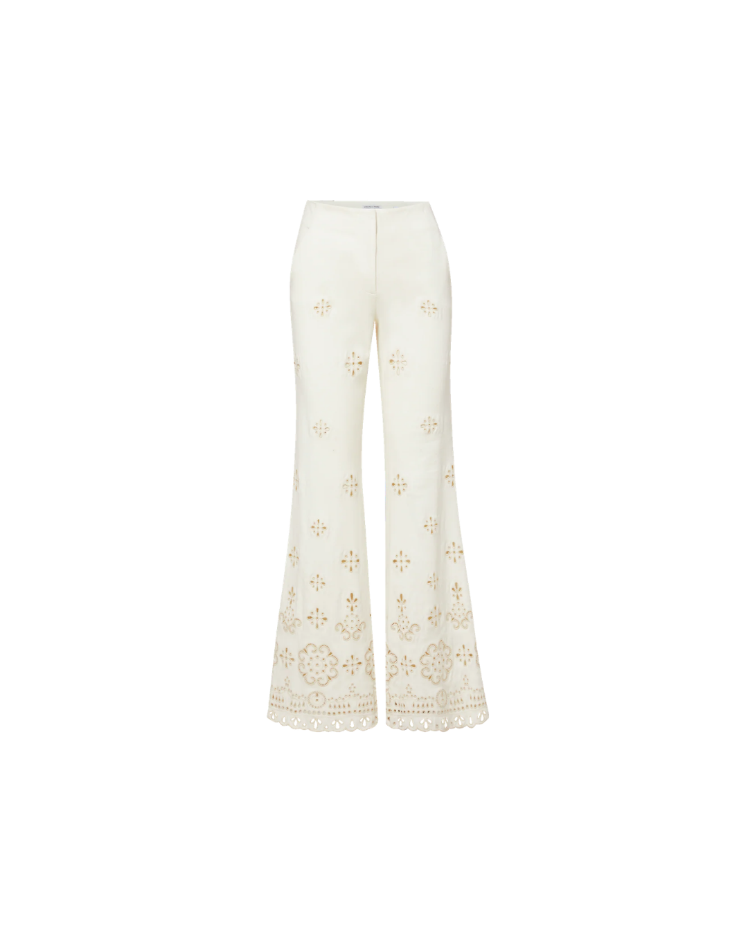 Expertly tailored from stretch cotton-twill in off-white, the Komi pant is defined by intricate custom eyelet details down each leg. Designed with a flattering, high-rise Hollywood waistband, it fits slim through the hips before widening to a relaxed, full-length flare with a scalloped hem. Slanted front pockets complete the look. Style it with the coordinating vest for a chic warm-weather set, or pair with a simple tank for an easy, casual feel.