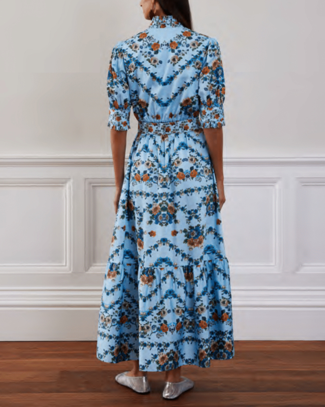 Our best-selling shirt dress returns in our magical Blossom placement print, framed in hand-painted hues of blue, burnt orange, moss green and soft white. With its cinched waist, ruffled high collar and sculpted sleeves, it’s feminine, polished and effortlessly elegant. Finished with a wicker-style belt buckle, this cotton beauty moves easily from daytime ease to cocktail chic.