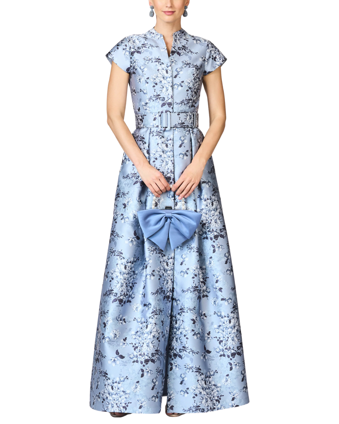 Make no mistake, the Marta Gown is no wallflower. She is the epitome of timeless, elevated personal style and quiet luxury. The fit and print are everything. The floor-length silhouette is partially inspired by the impeccable tailoring of a "shirt style" fit. This incredibly flattering body finds its way into our Iced Cherry Blossom print. A banded collar is tastefully cut away to meet concealed front buttons. Our Mikado fabric with the mono-color florals makes this dress a classic and a statement all at once.