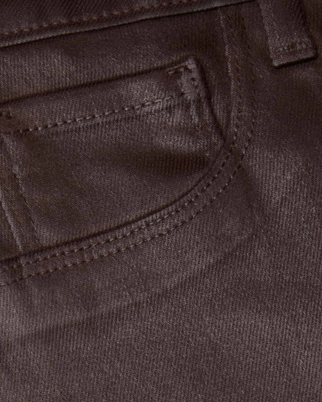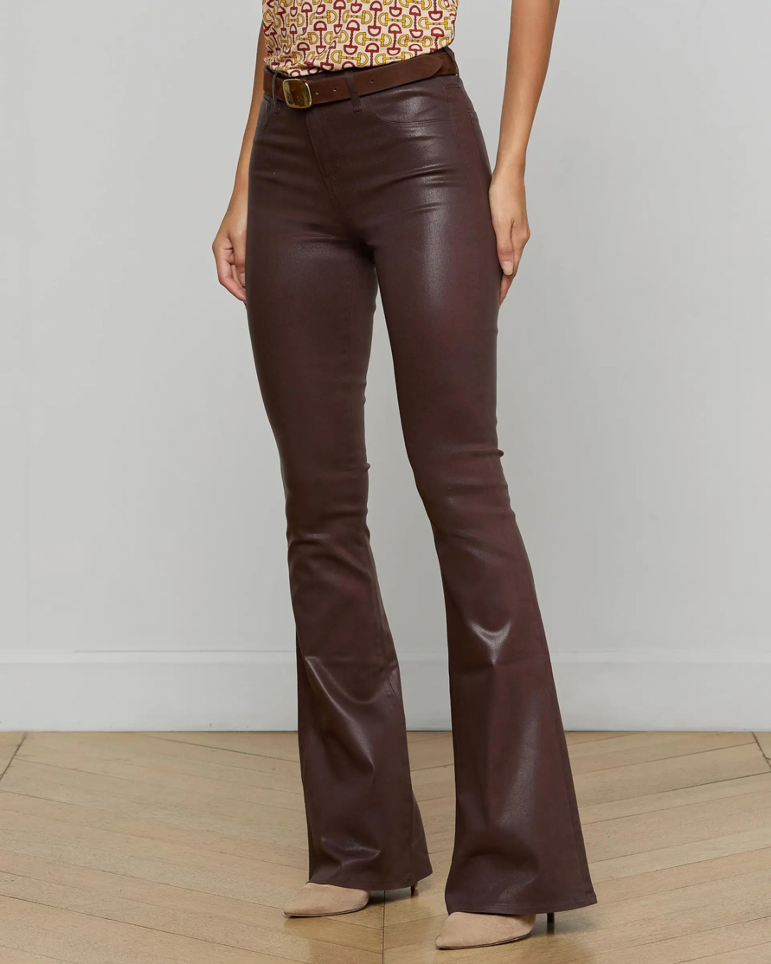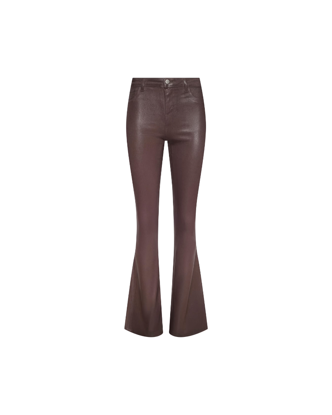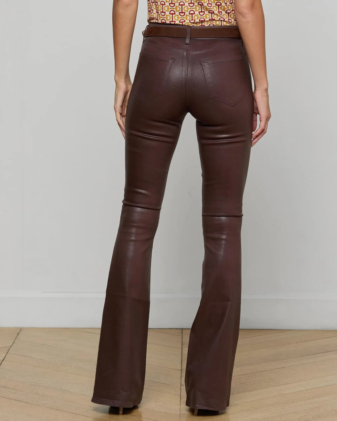 A perfectly proportioned fit in a modern fabrication. The Marty flare jean is now back in a chocolate brown shade of our leather alternative coated denim.