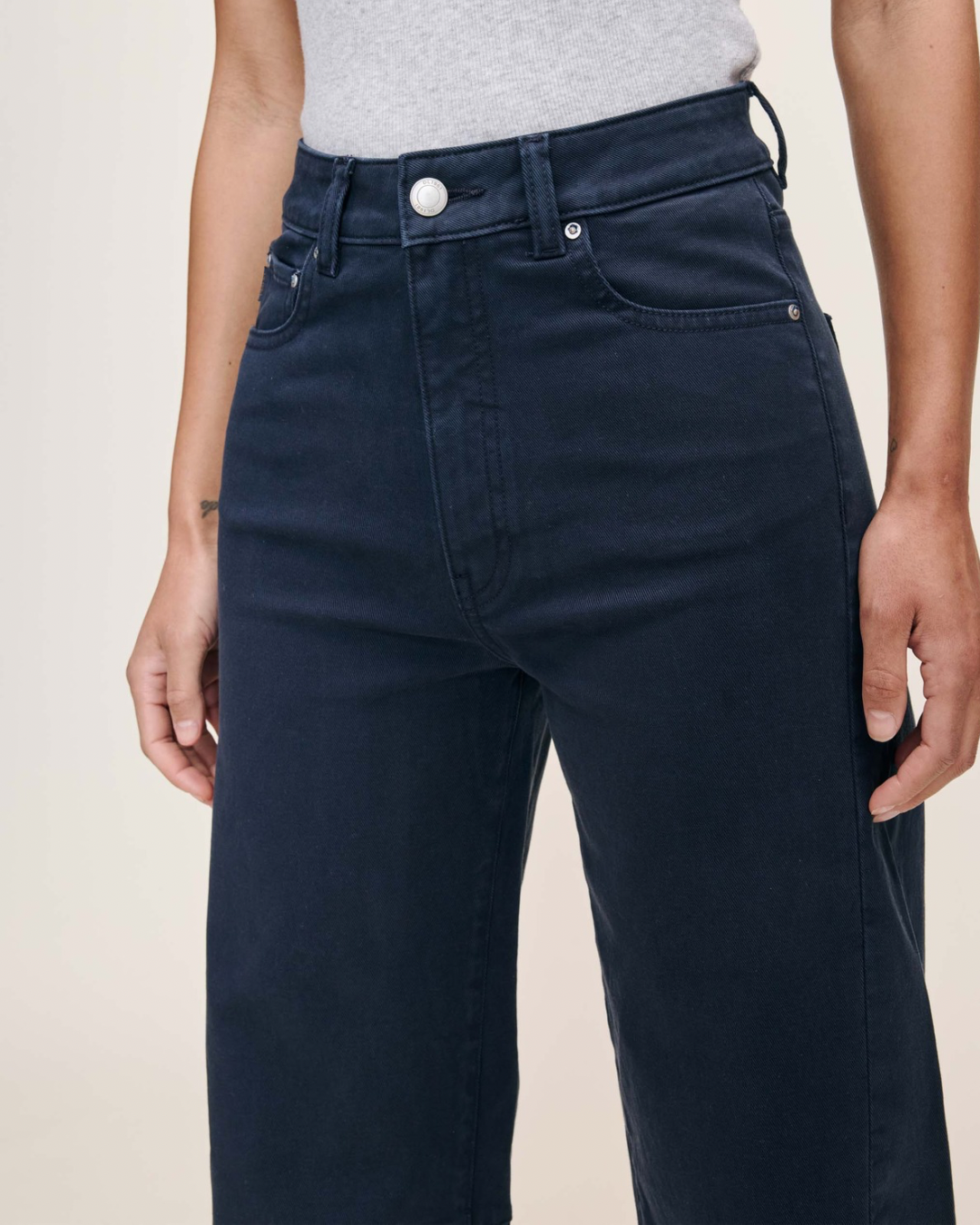 Miro is a high-rise, true barrel leg pant that is fitted at the hip with a 28" inseam, tapering at the leg.