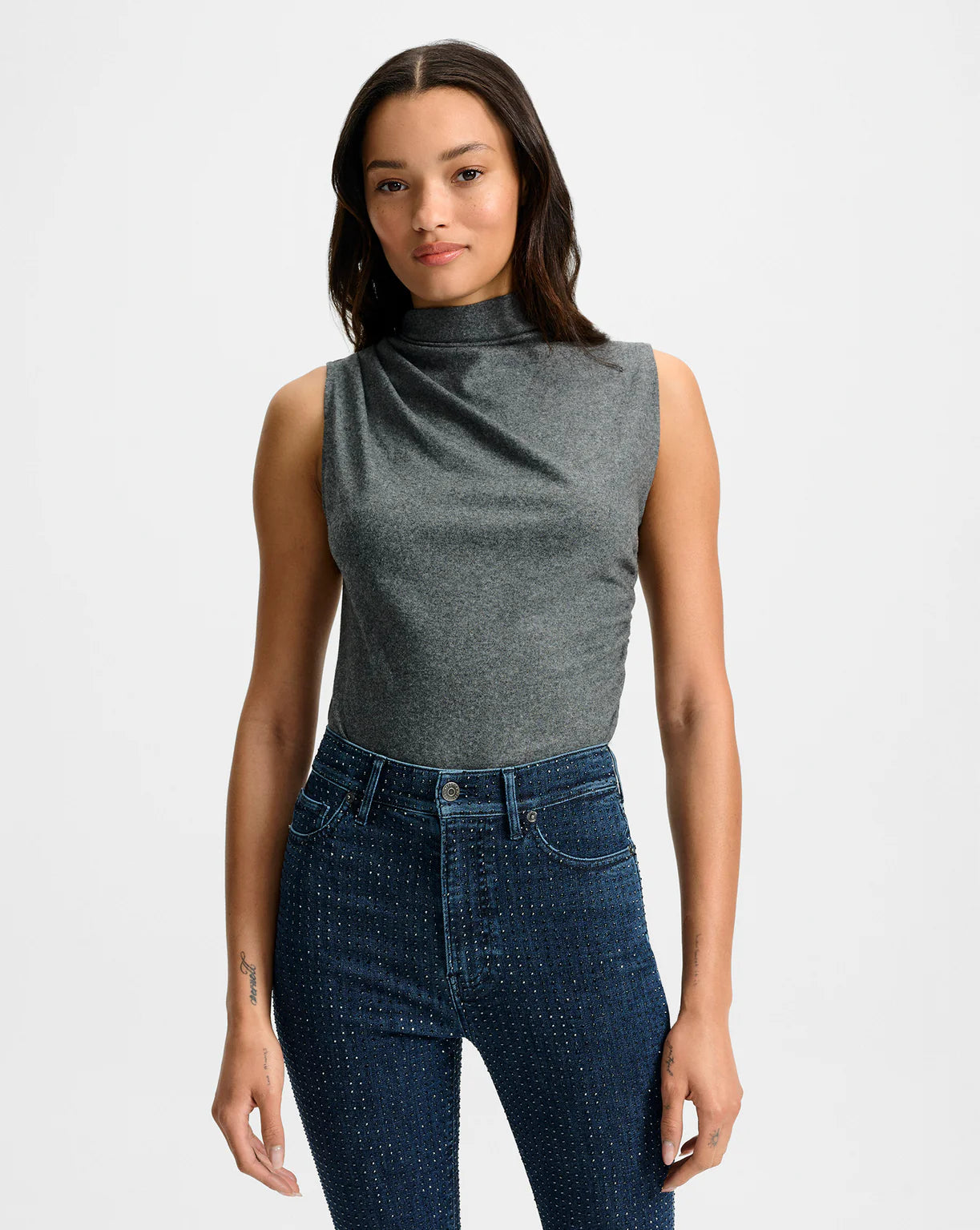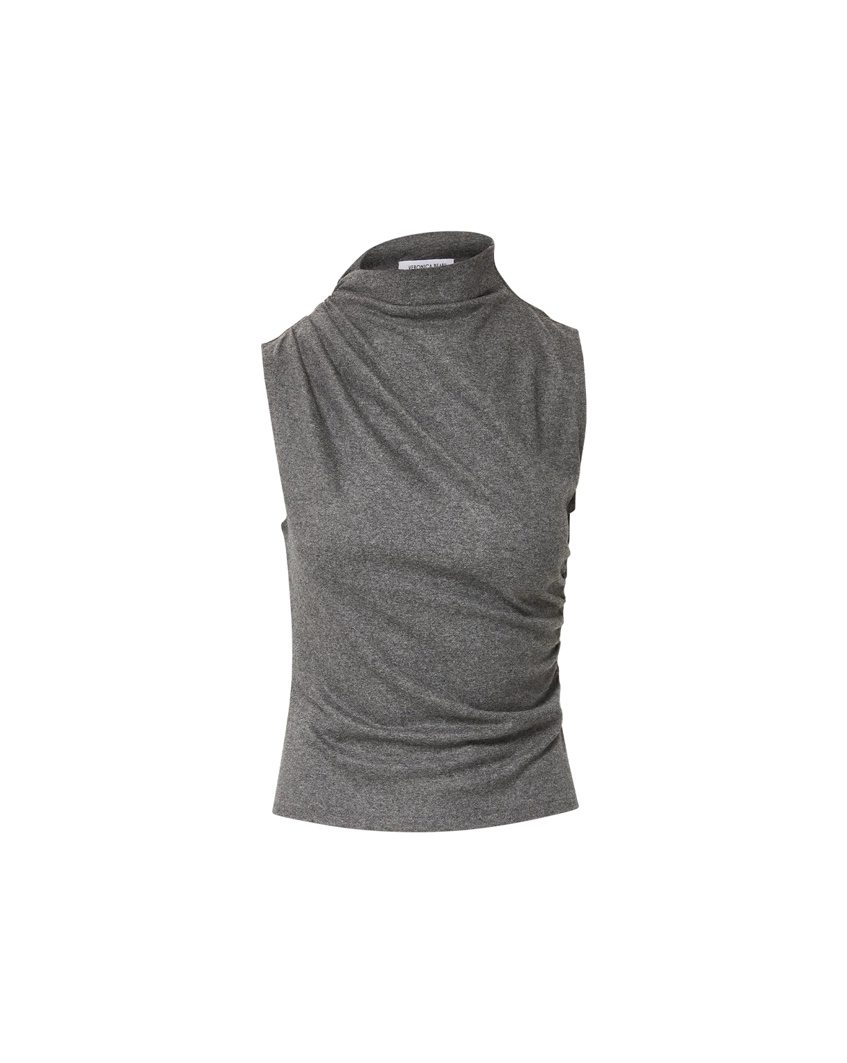 An essential, elevated. Crafted from a premium Italian wool blend, the Mylie reimagines the classic grey tank with a mock neckline and subtle side ruching. Its draped, sleeveless silhouette falls in soft folds, creating fluid, flattering shape. Designed for versatility, it layers seamlessly under sweaters and jackets or wears beautifully on its own.