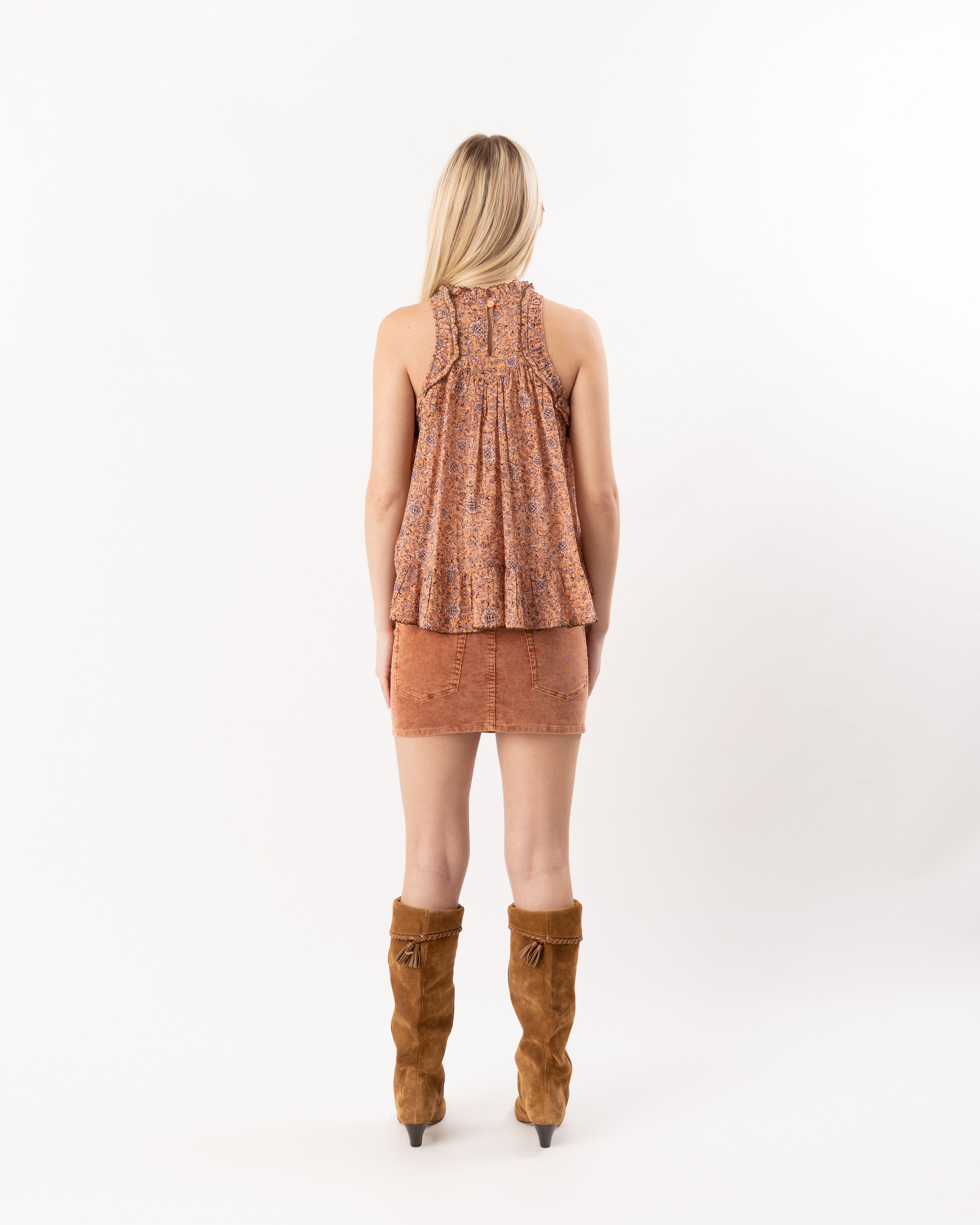 Elevate your wardrobe with the Olinda Skirt, a rust-colored cord mini skirt that blends classic denim durability with a warm, trendy hue. Its flattering cut and rich color make it perfect for stylish, casual looks that stand out effortlessly.