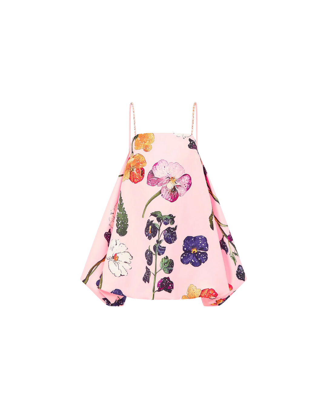 A playful scattering of detailed wildflowers in vibrant purple, orange, and white bloom across a delicate pink base. Sparkling, intricate, and bursting with whimsical charm.