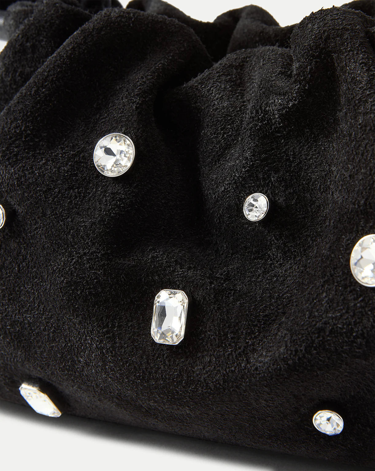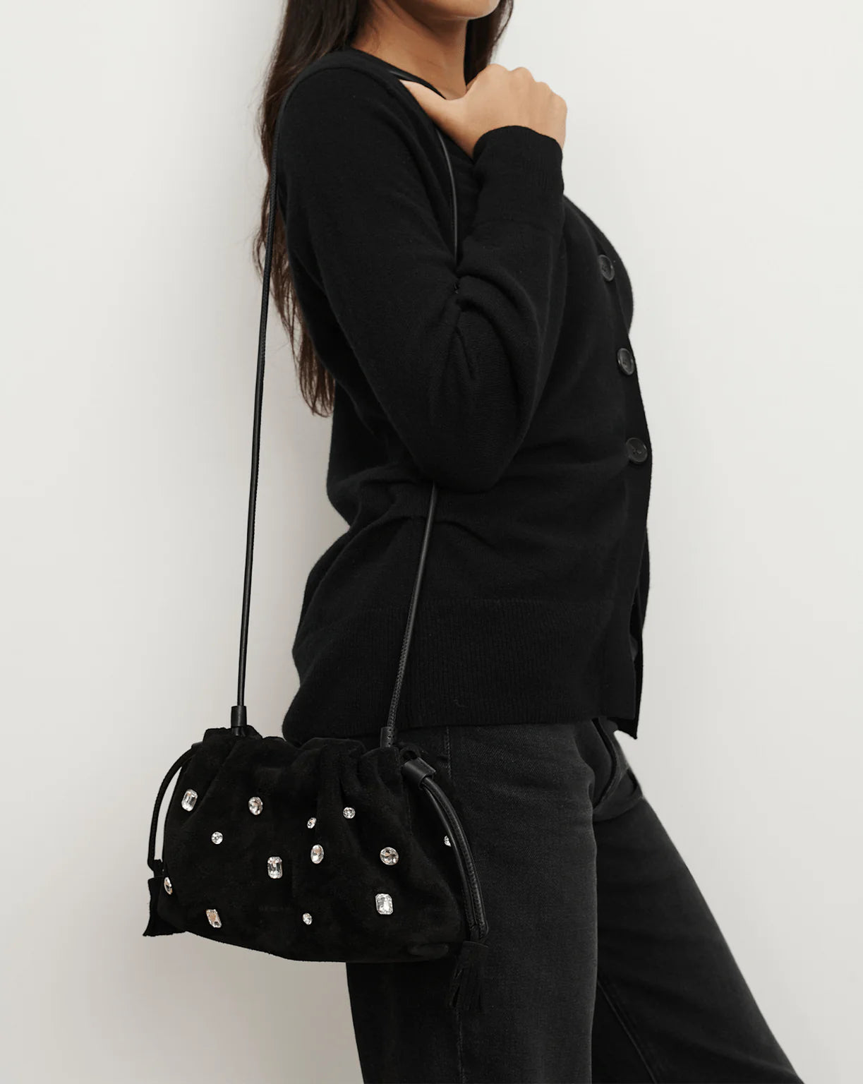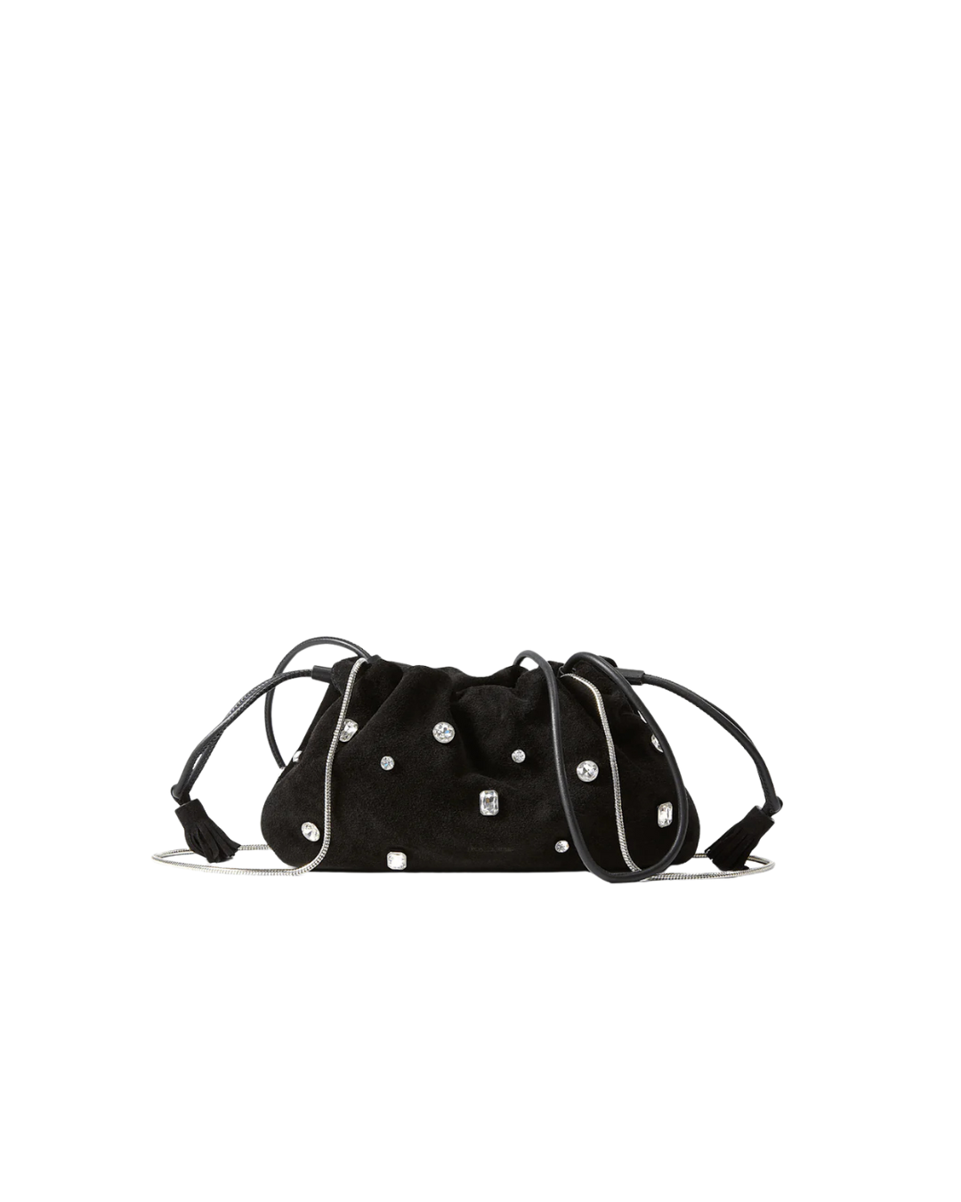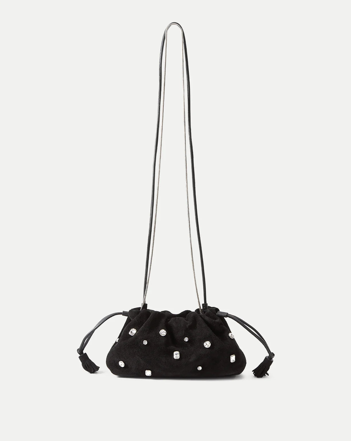 A petite, statement-making take on our classic Stash bag. Crafted from black Italian suede and embellished with assorted crystals, this pouch features a softly structured silhouette with a gathered, cinchable top, finished with leather tasseled drawstrings at both ends. Two straps—one in smooth leather, the other a silver snake chain—offer maximum versatility. Inside, a zip pocket and magnetic tab closure keep your essentials secure.