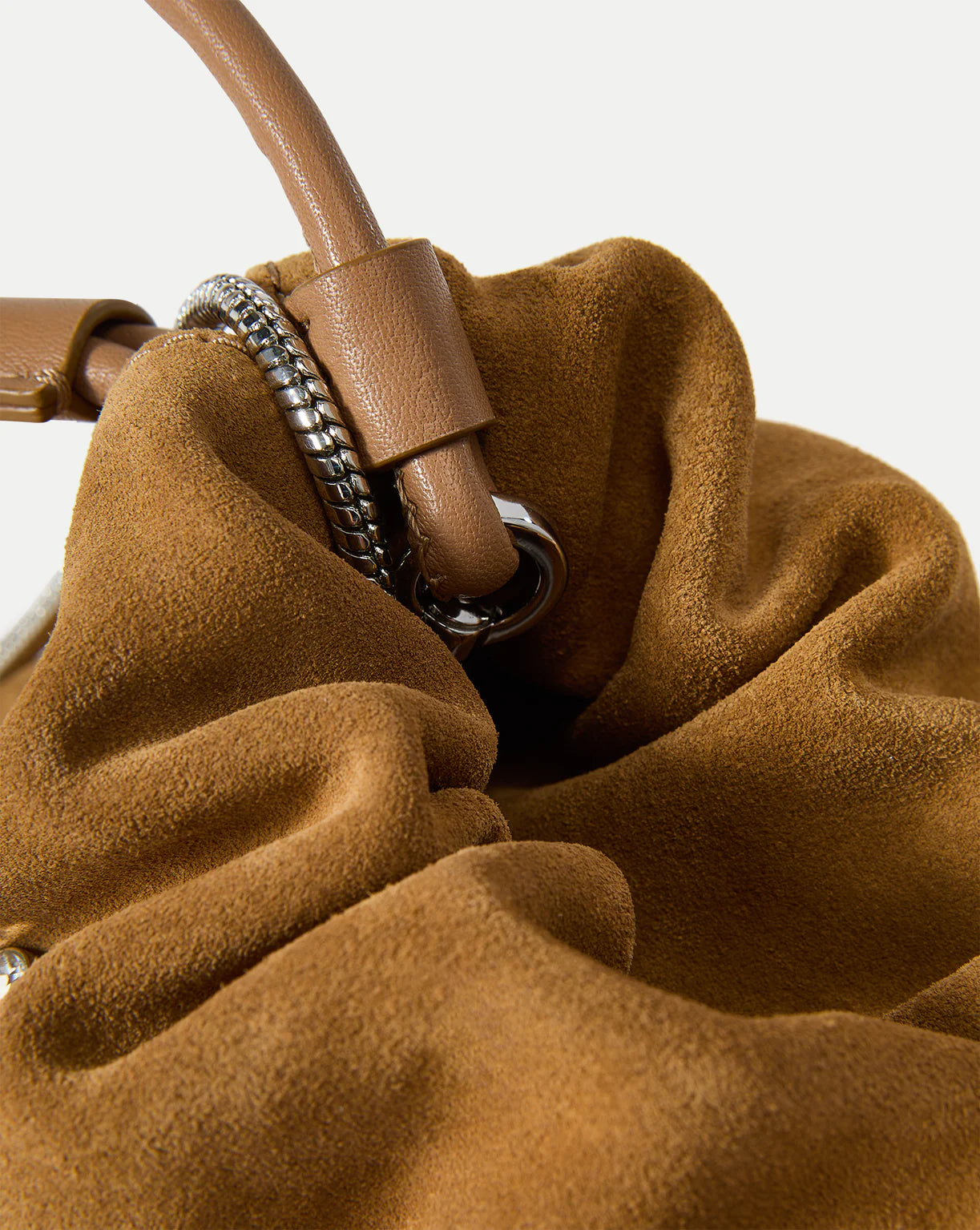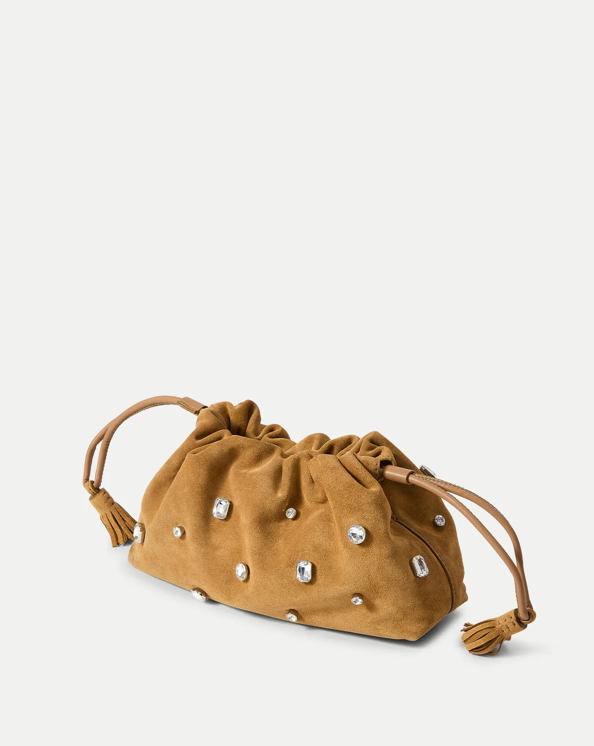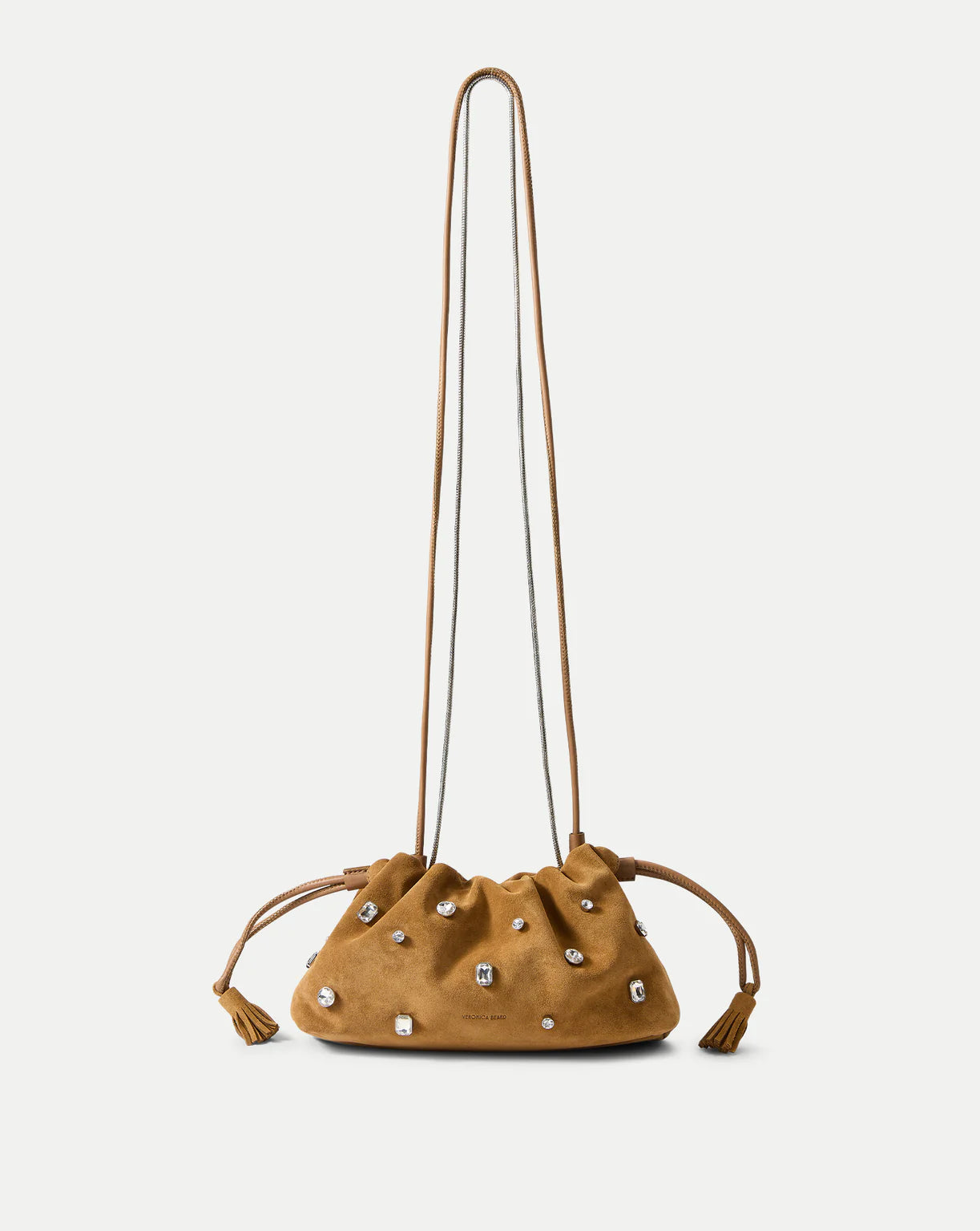 A petite, statement-making take on our classic Stash bag. Crafted from tan Italian suede and embellished with assorted crystals, this pouch bag features a softly structured silhouette with a gathered, cinchable top, finished with leather tasseled drawstrings at both ends. Two straps—one in smooth leather, the other a silver snake chain—offer maximum versatility. Inside, a zip pocket and magnetic tab closure keep your essentials secure.