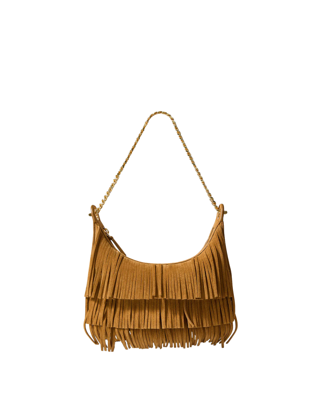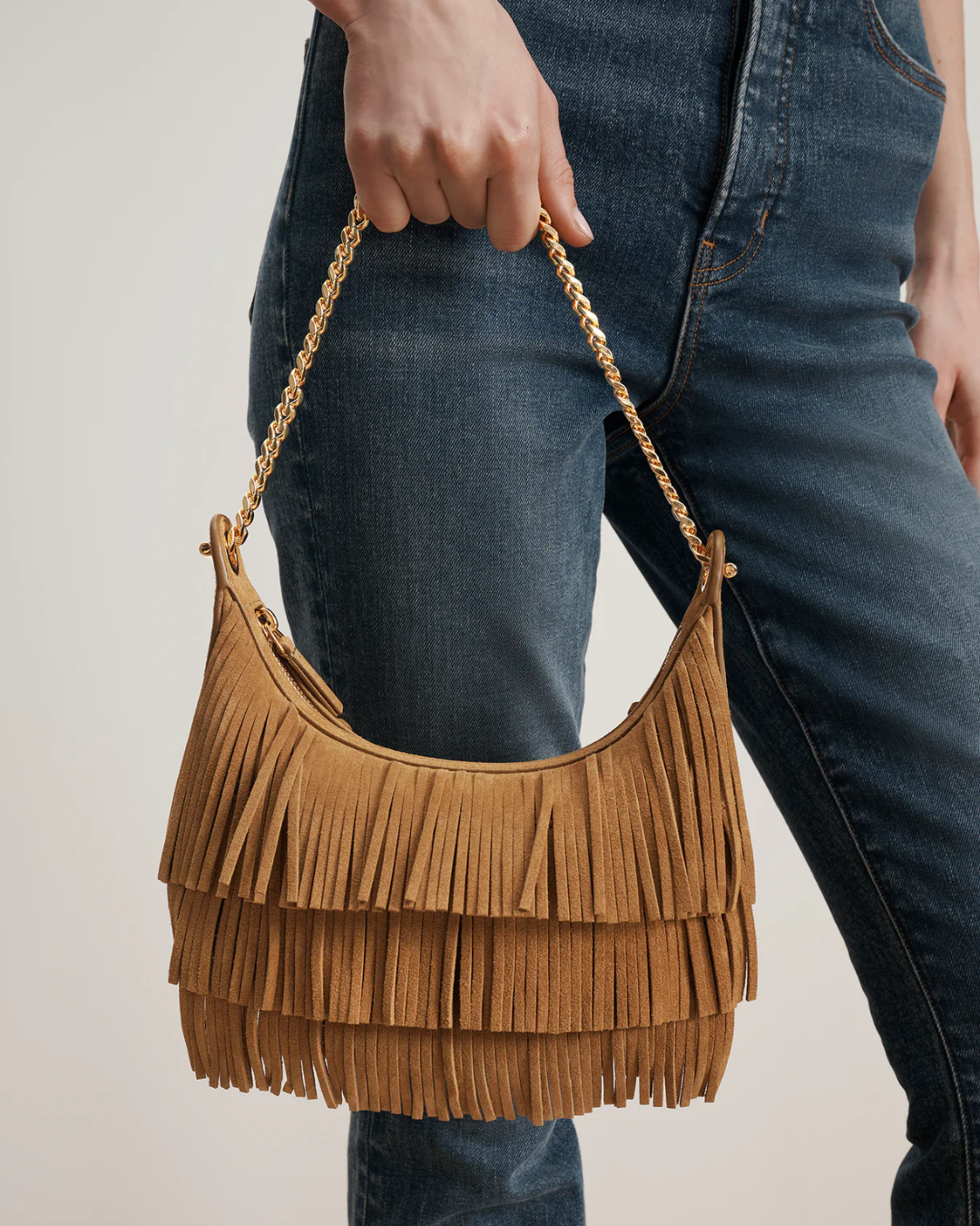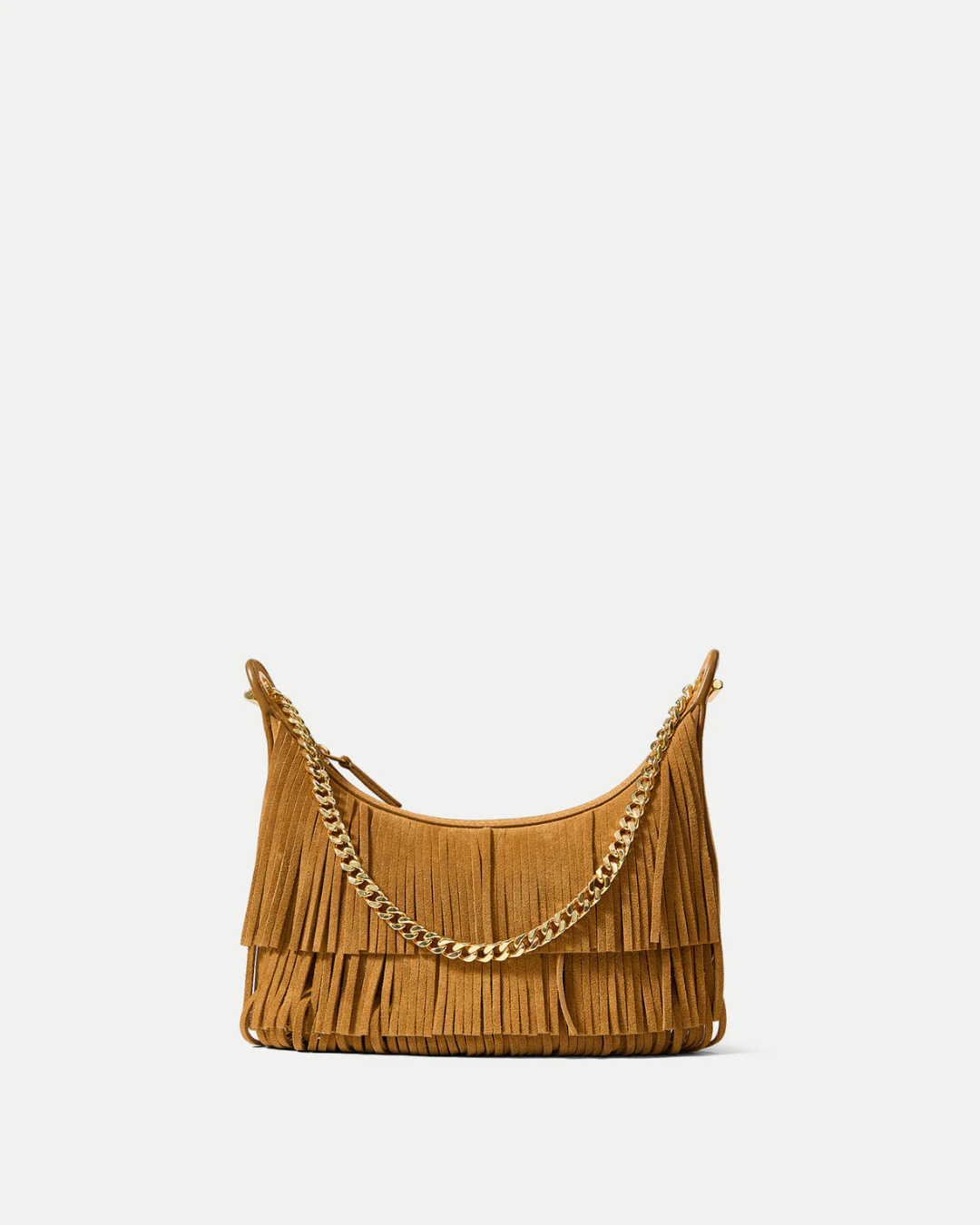 A chic little shoulder bag with day-to-night versatility. The Fortune bag features a softly curved silhouette—compact yet roomy enough for your phone and essentials—defined by a chain-link strap and fully fringed body for a modern bohemian edge. It’s crafted from tan butter-soft Italian suede for a luxe feel. Finished with a removable, adjustable crossbody strap for ease, it's the perfect bag to take you from desk to dinner.