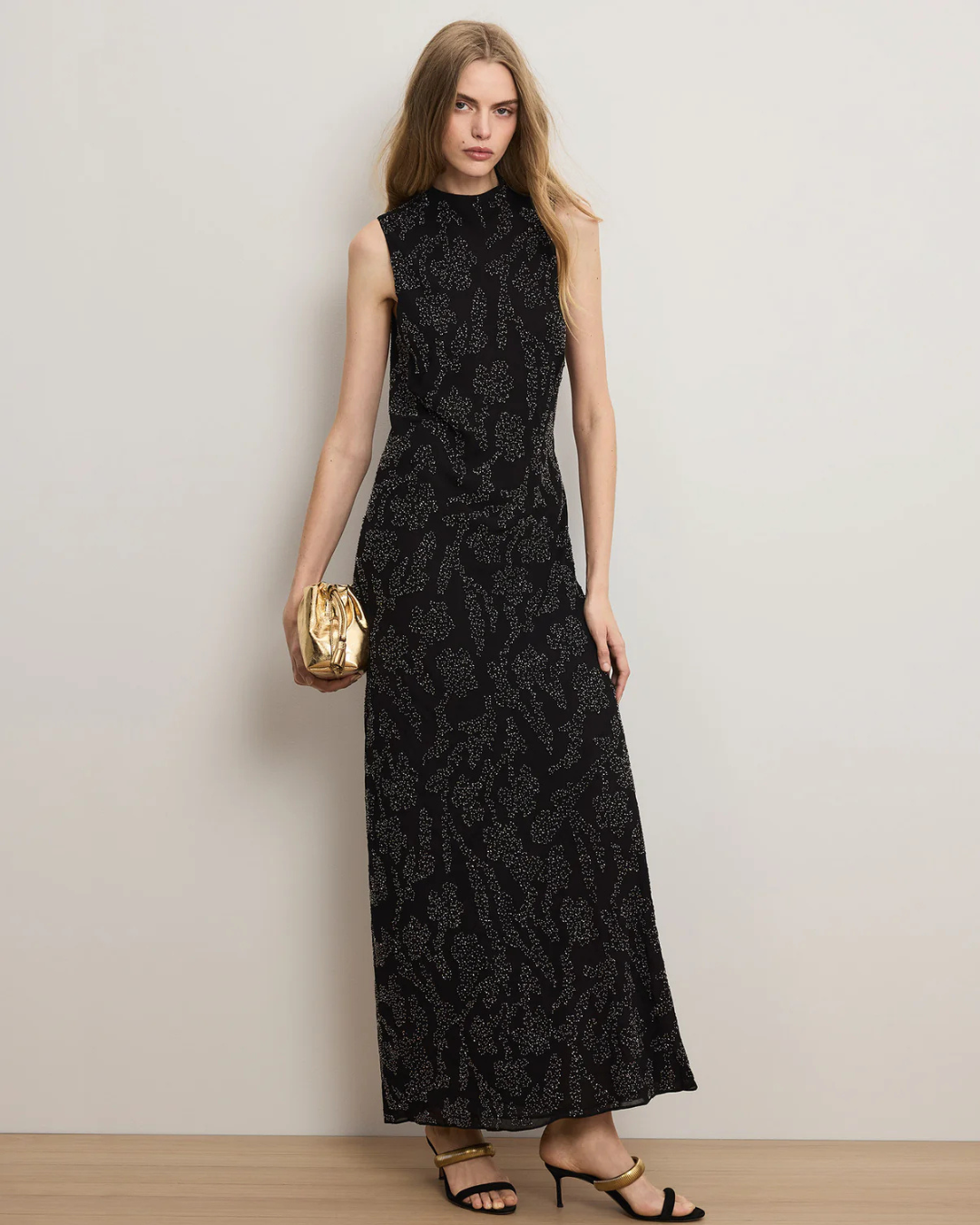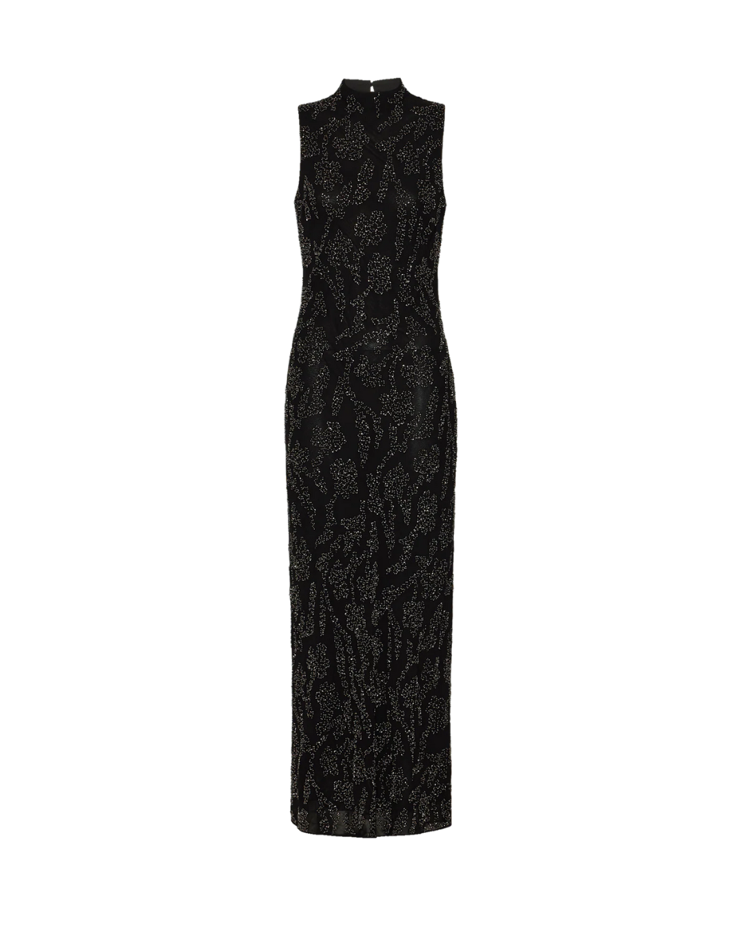 A maxi that makes a statement. Crafted from sheer, black georgette, the Sylven sleeveless dress is cut for a slim, body-skimming fit and features silver floral hand beading for a high-shine finish. An elegant mock neck, keyhole back closure, and detachable slip complete the look. A chic choice for your next big event—just add heels and go.