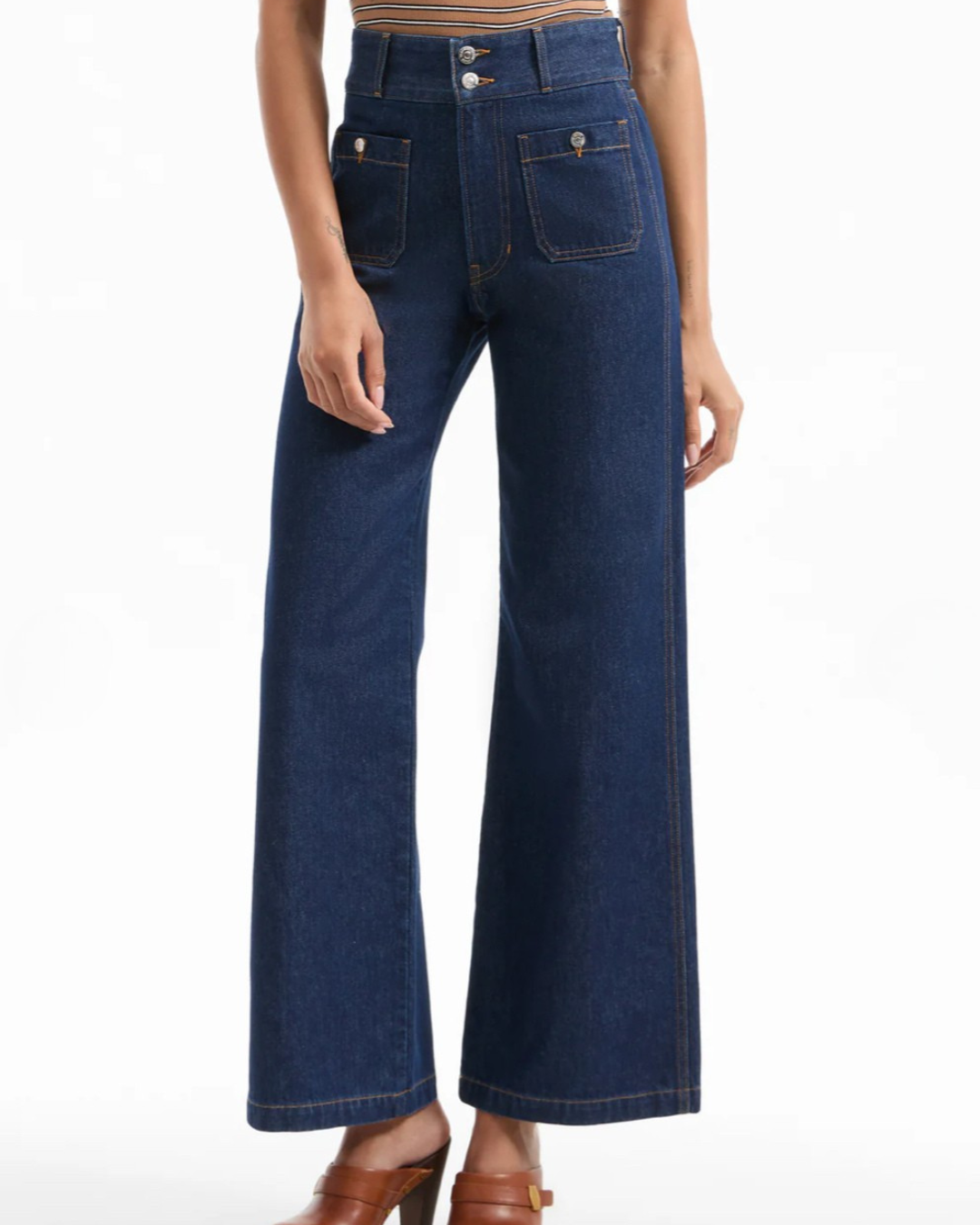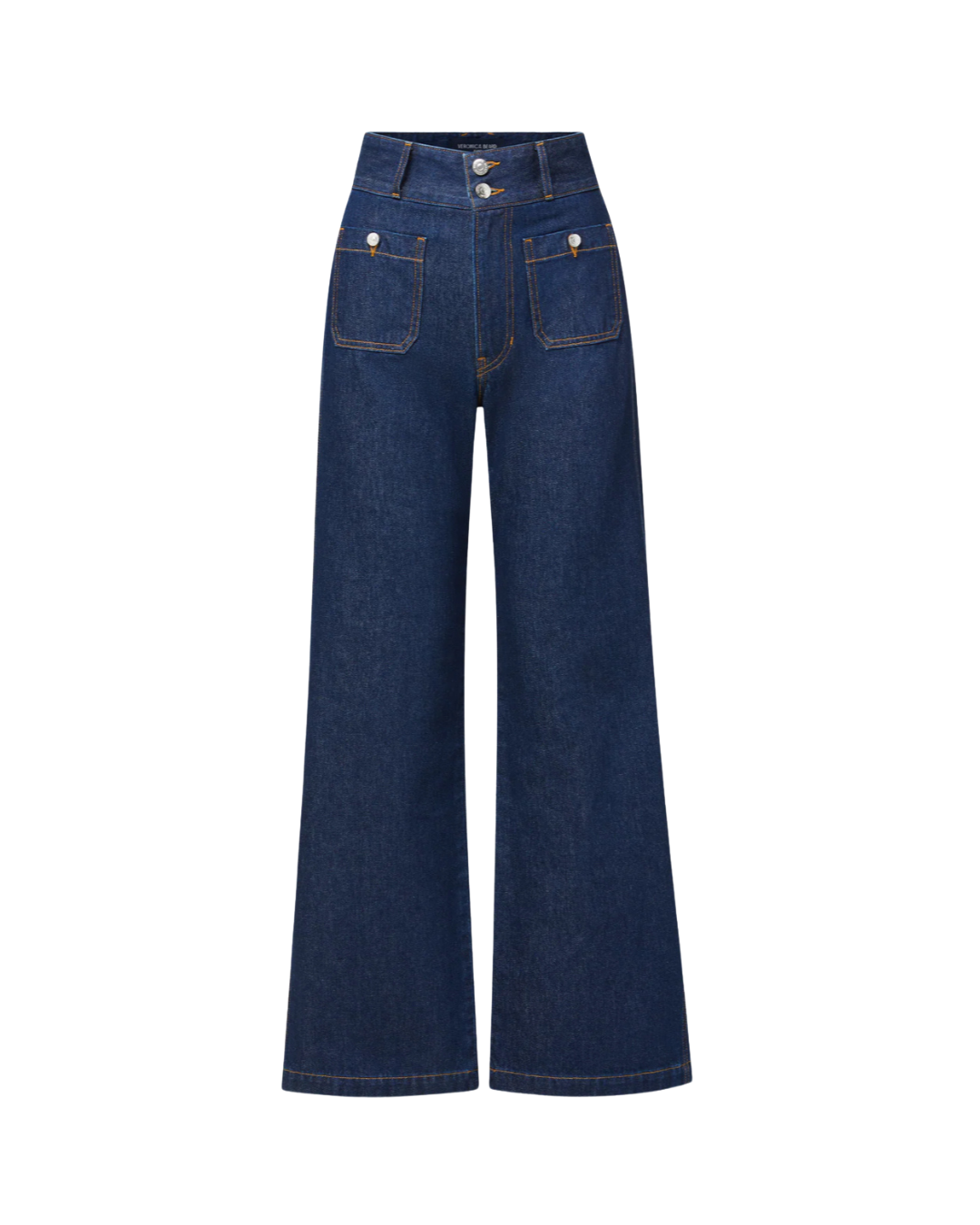 The Taylor you know and love—now with front patch pockets and an extra-wide, double-button waistband for added definition. Everything else you love about the style remains the same, from the high-rise to the wide-leg silhouette. Made in LA from non-stretch Japanese denim in a dark indigo wash, this VB best-seller is a year-round must-have.
