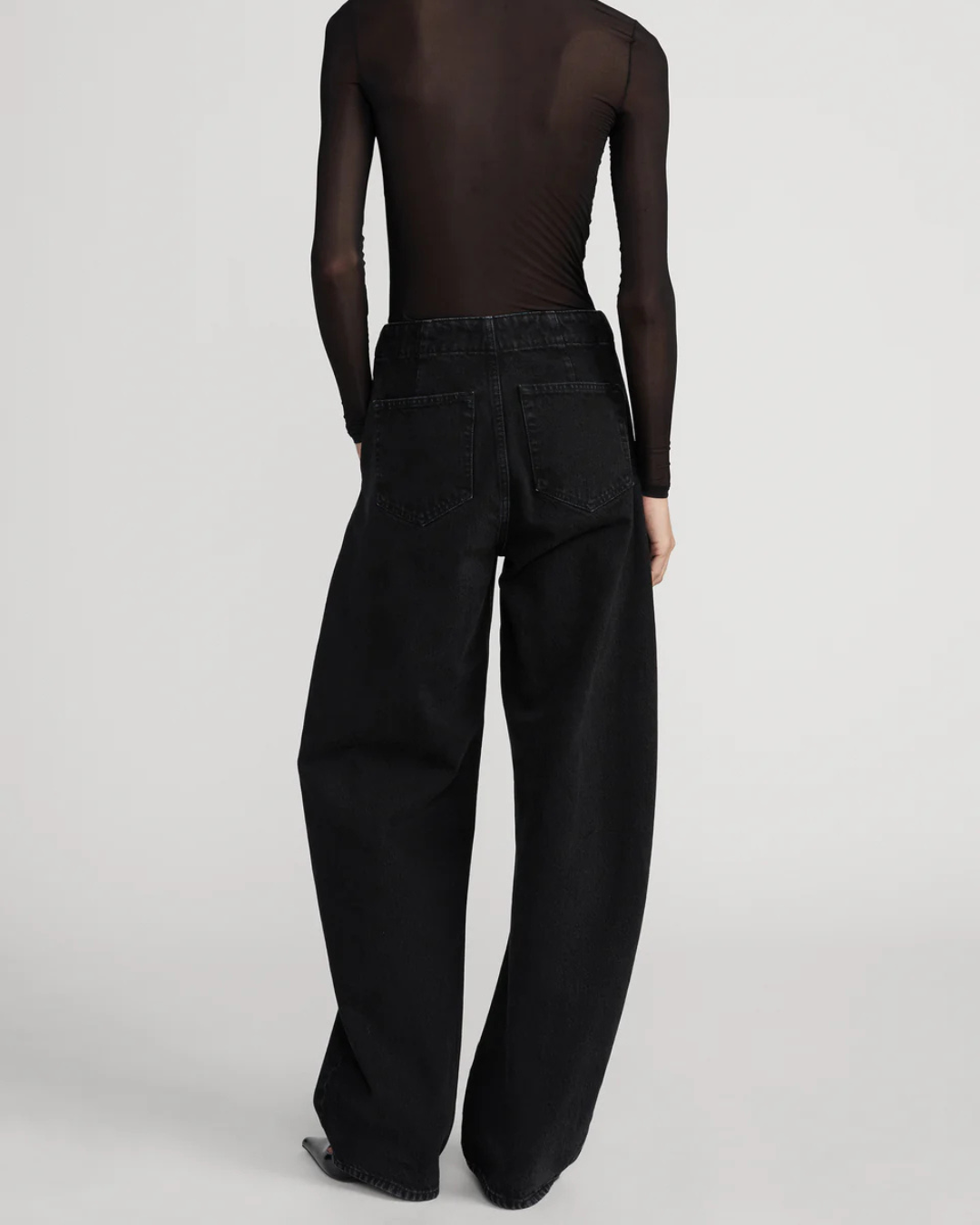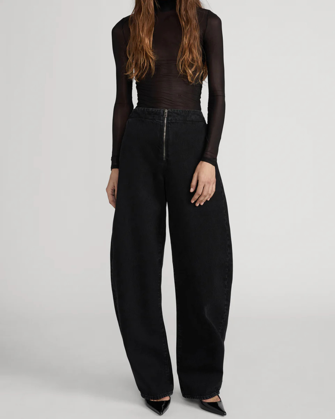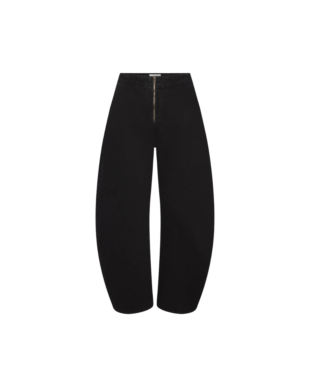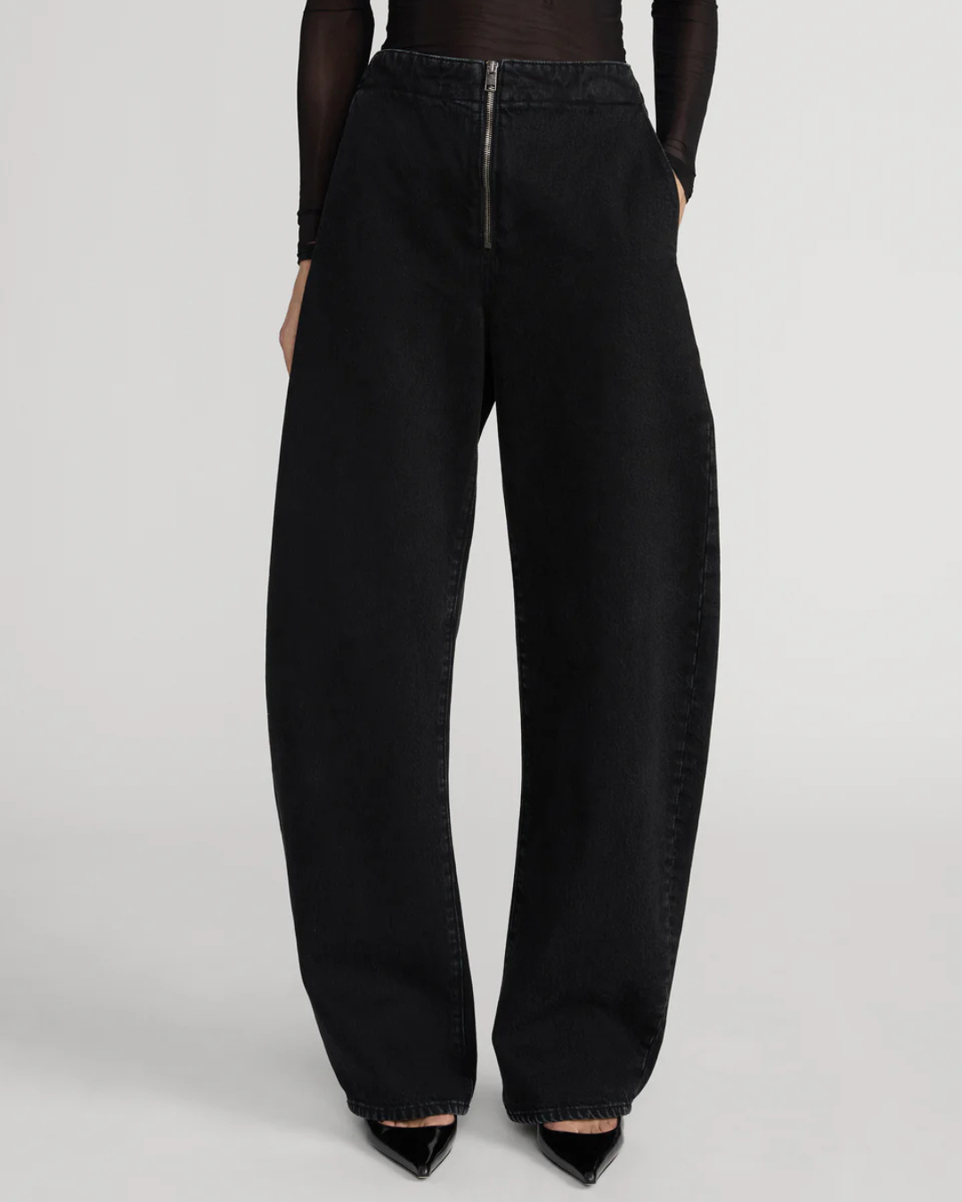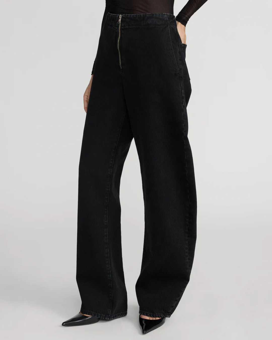 This jean features an exposed zipper, trouser pockets, and a playful curved outseam for an unexpected twist on structure.