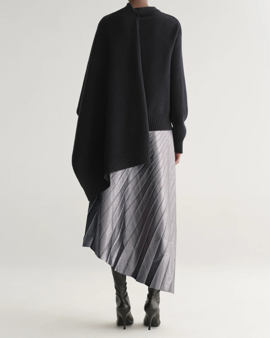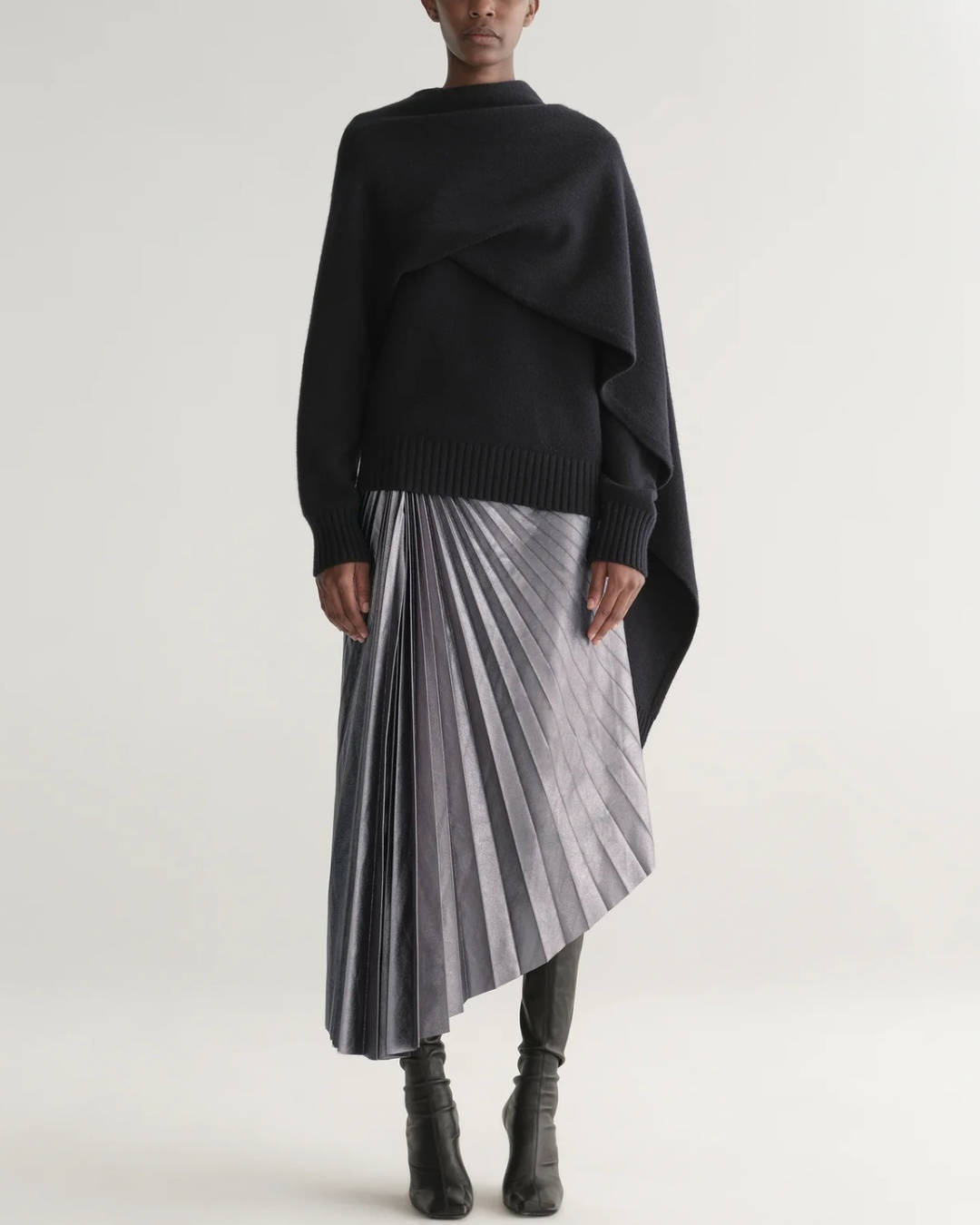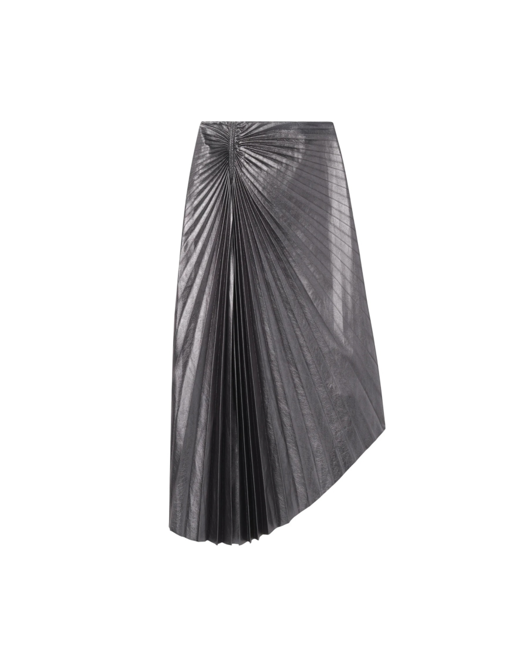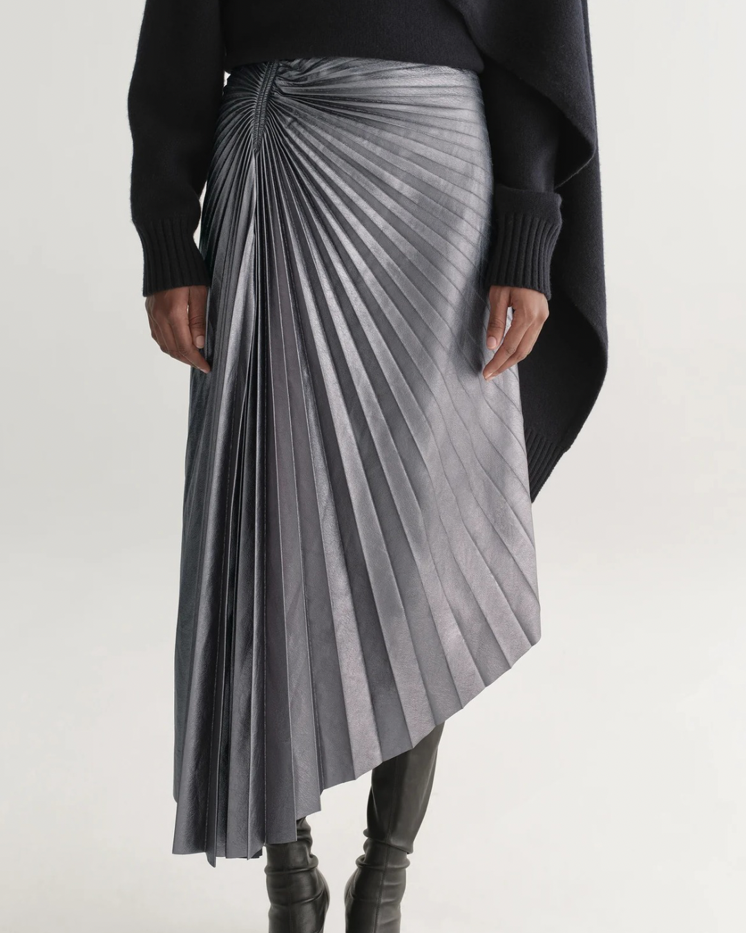 The Tracy Skirt is your sculptural statement for festive dressing. Cut from lightweight metallic vegan leather with soft structure and fluid drape, this midi silhouette features ruched detailing at the hip that flows into dramatic sunburst pleats. A fishtail hem adds architectural flair, creating a dynamic, asymmetric shape perfect for holiday dinners, parties, or evening events.