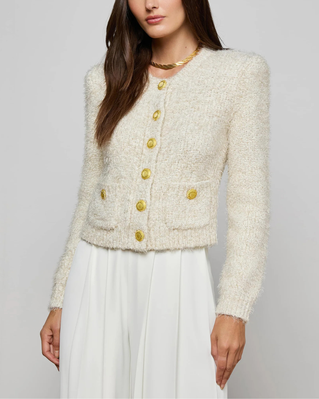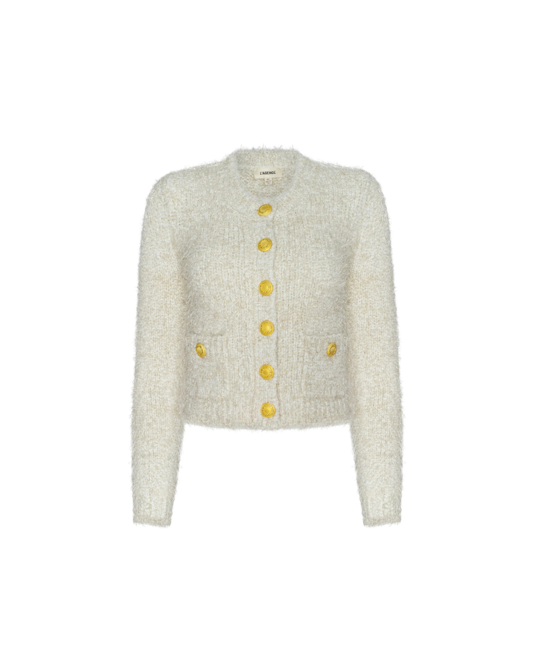 The Una Knit Cardigan combines a soft eyelash knit with metallic yarns for a textured, dimensional look. Its tailored silhouette features bold gold buttons, patch pockets, and a round neckline, offering a polished and stylish finish. Ideal for layering over sleek basics or pairing with denim, this versatile piece can be worn as a top or a second layer throughout the season. Now available in white with subtle gold threads for added elegance.