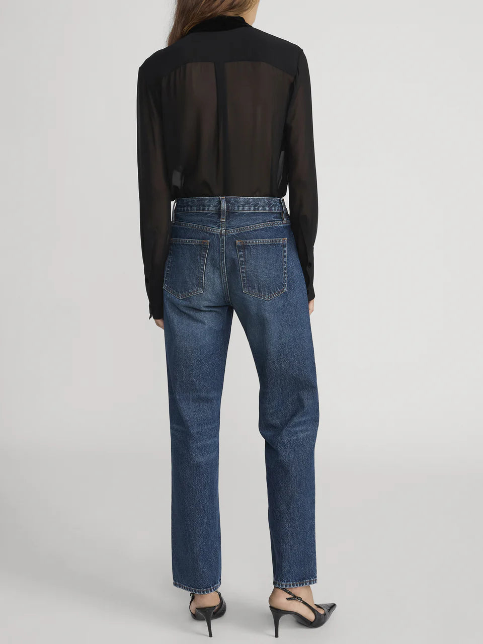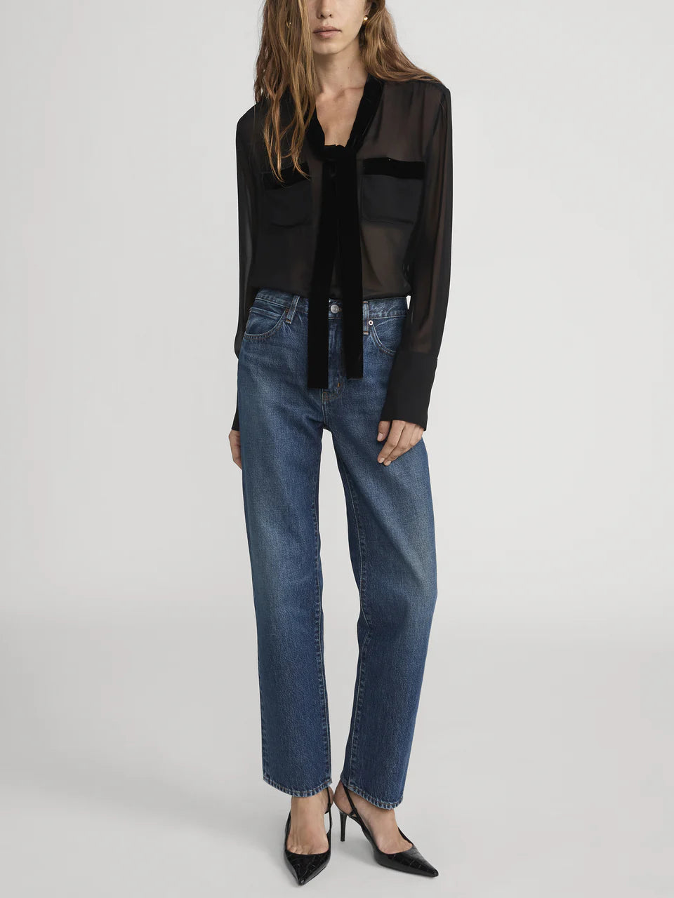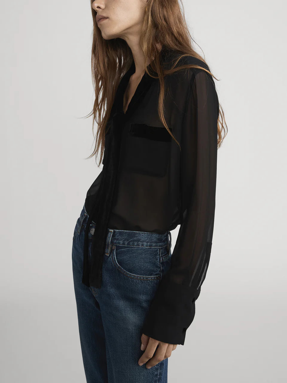 This feminine blouse is crafted from sheer black silk and elevated by soft velvet trim along the tie and front patch pockets. With long, graceful sleeves and a light, airy quality. A subtly sexy top to reach for again and again.