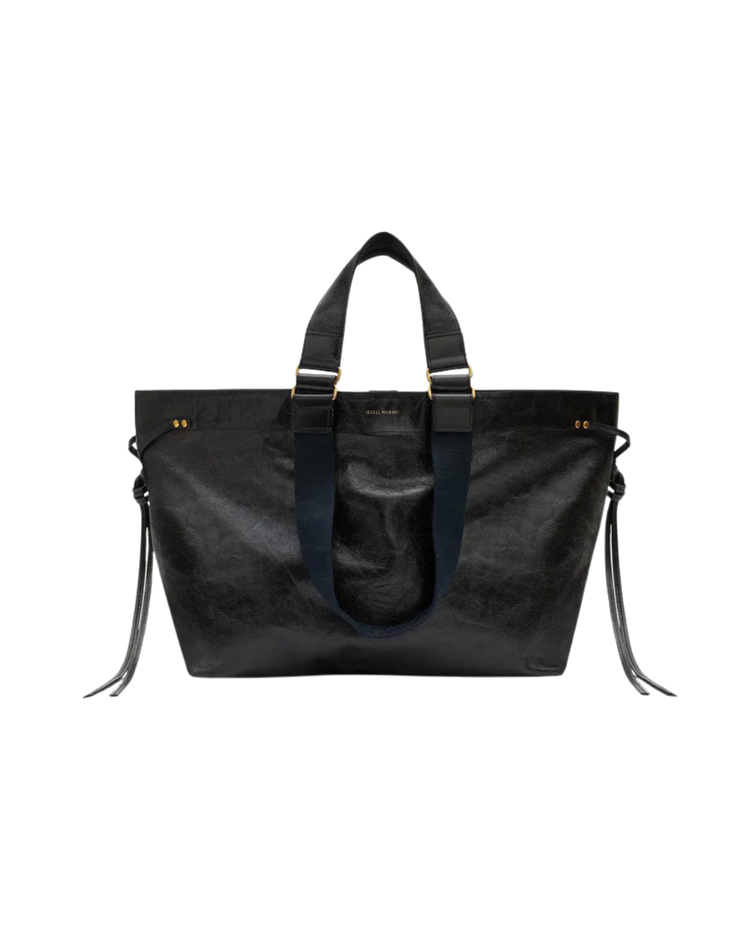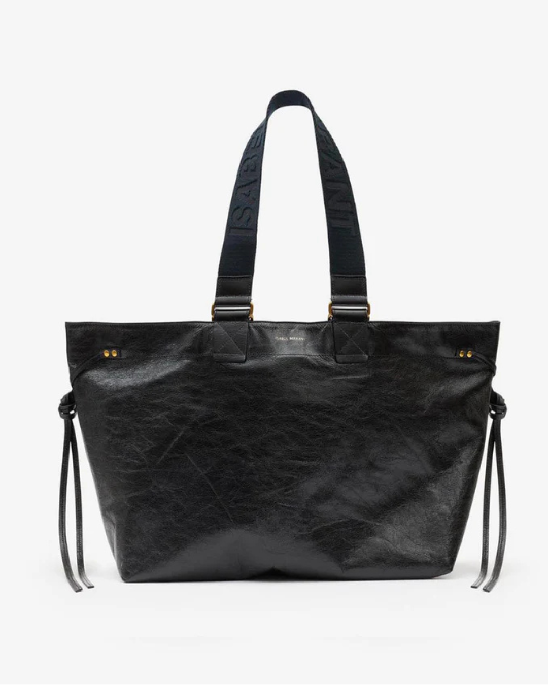 Embossed logo in gold-plated lettering on the front of the bag